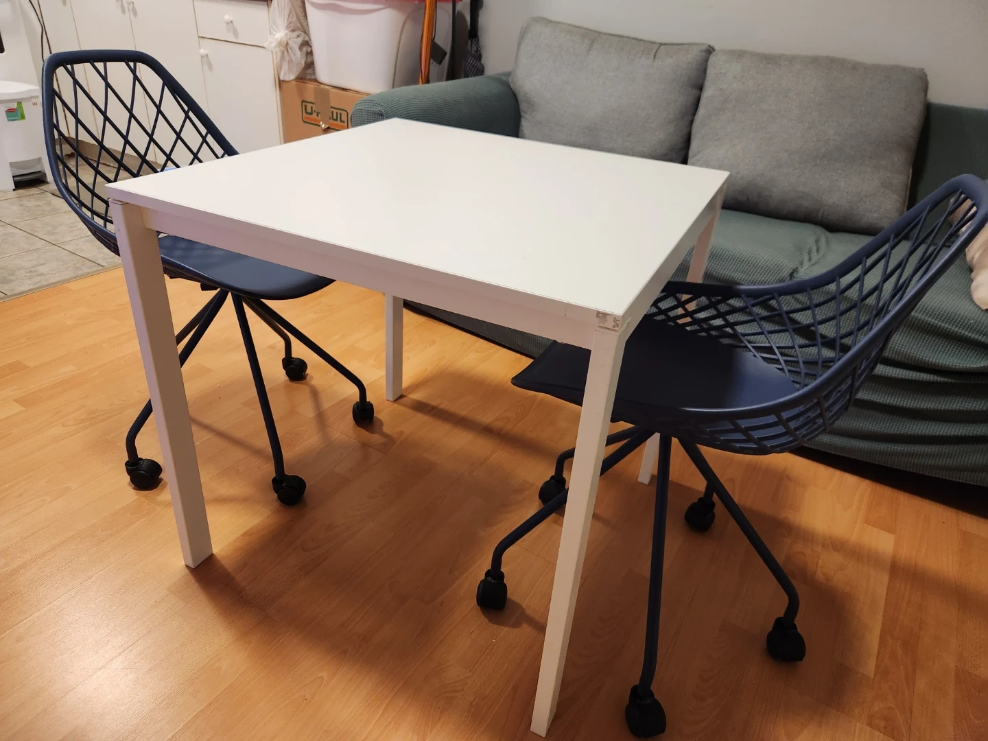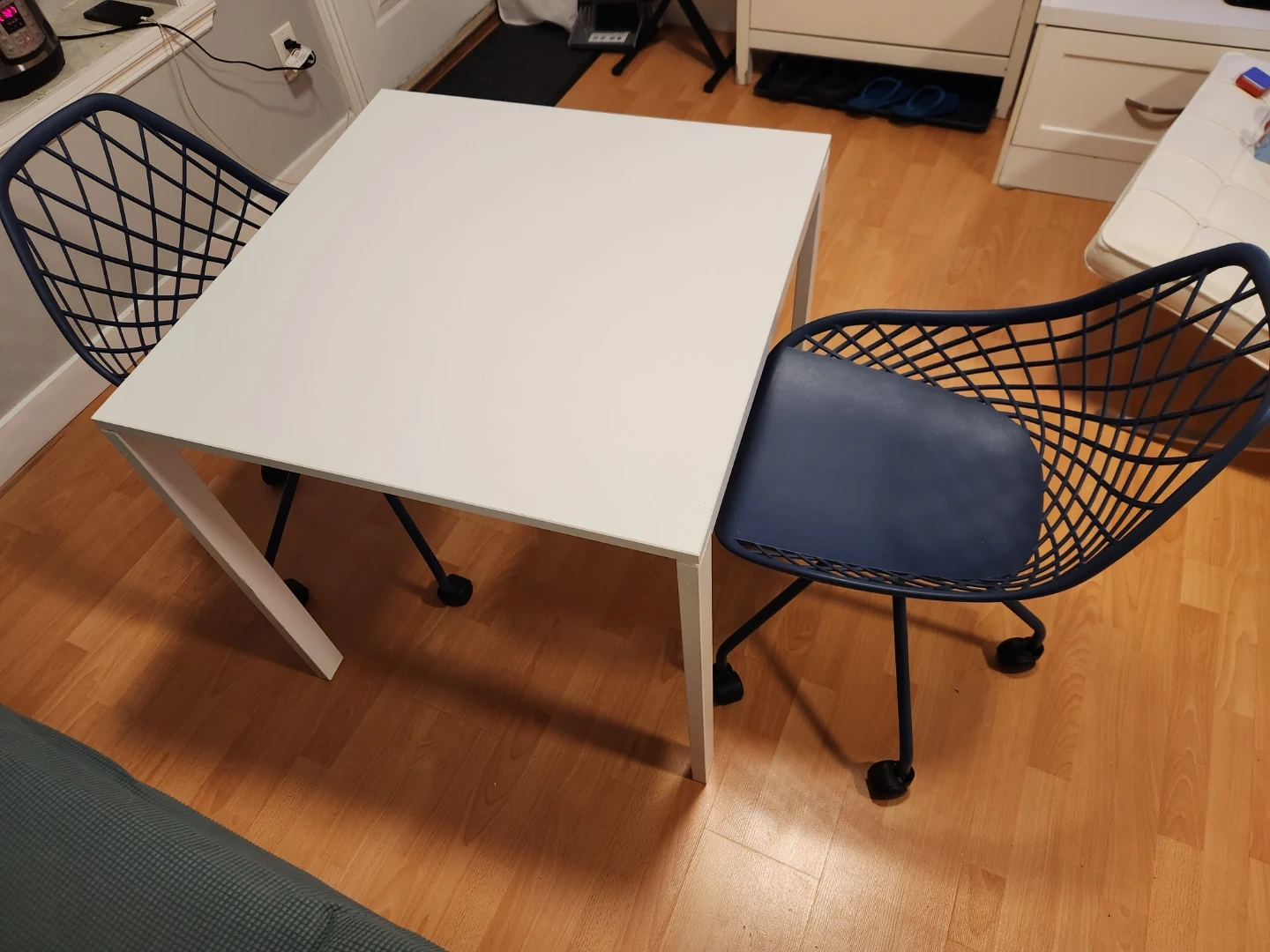 White square dining table with two blue swivel chairs. Chairs have a diamond pattern back and are on wheels. Great for a small kitchen or dining nook!