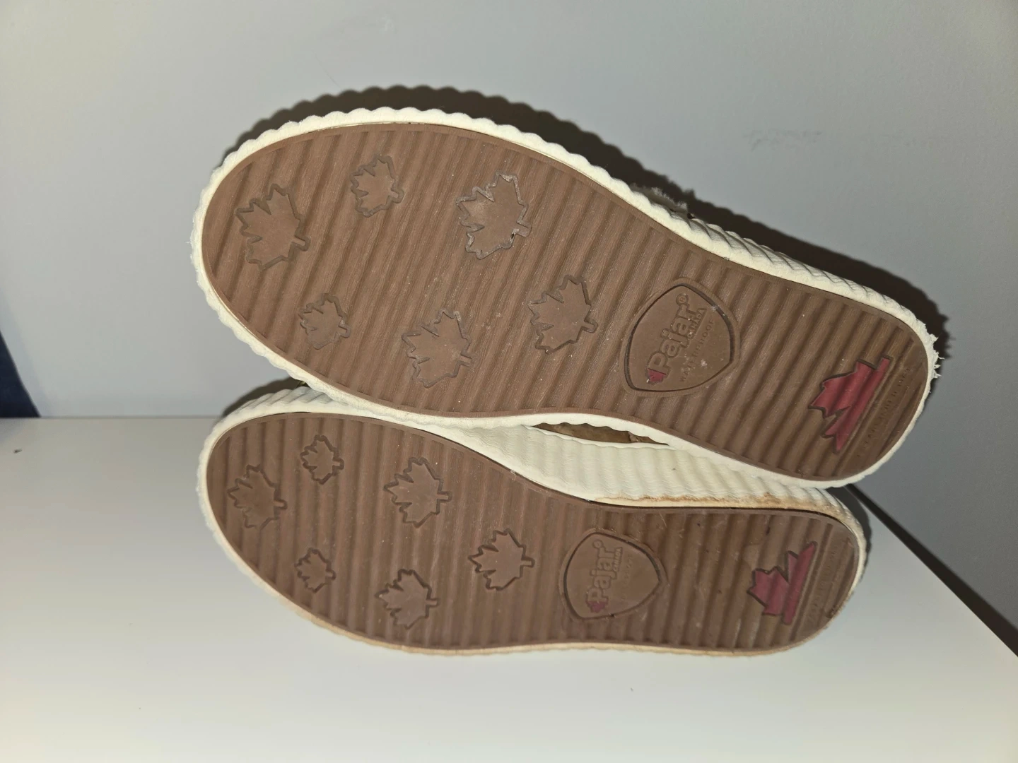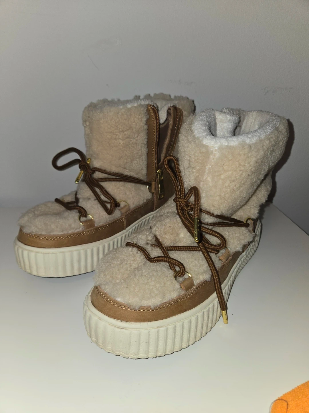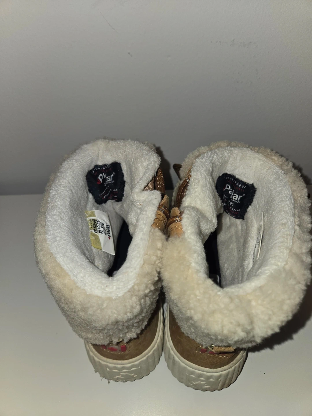 Cozy beige Pajar winter boots with shearling lining and tan suede accents. Featuring lace-up fronts and side zippers for easy wear. These boots are waterproof and perfect for keeping warm in colder weather!