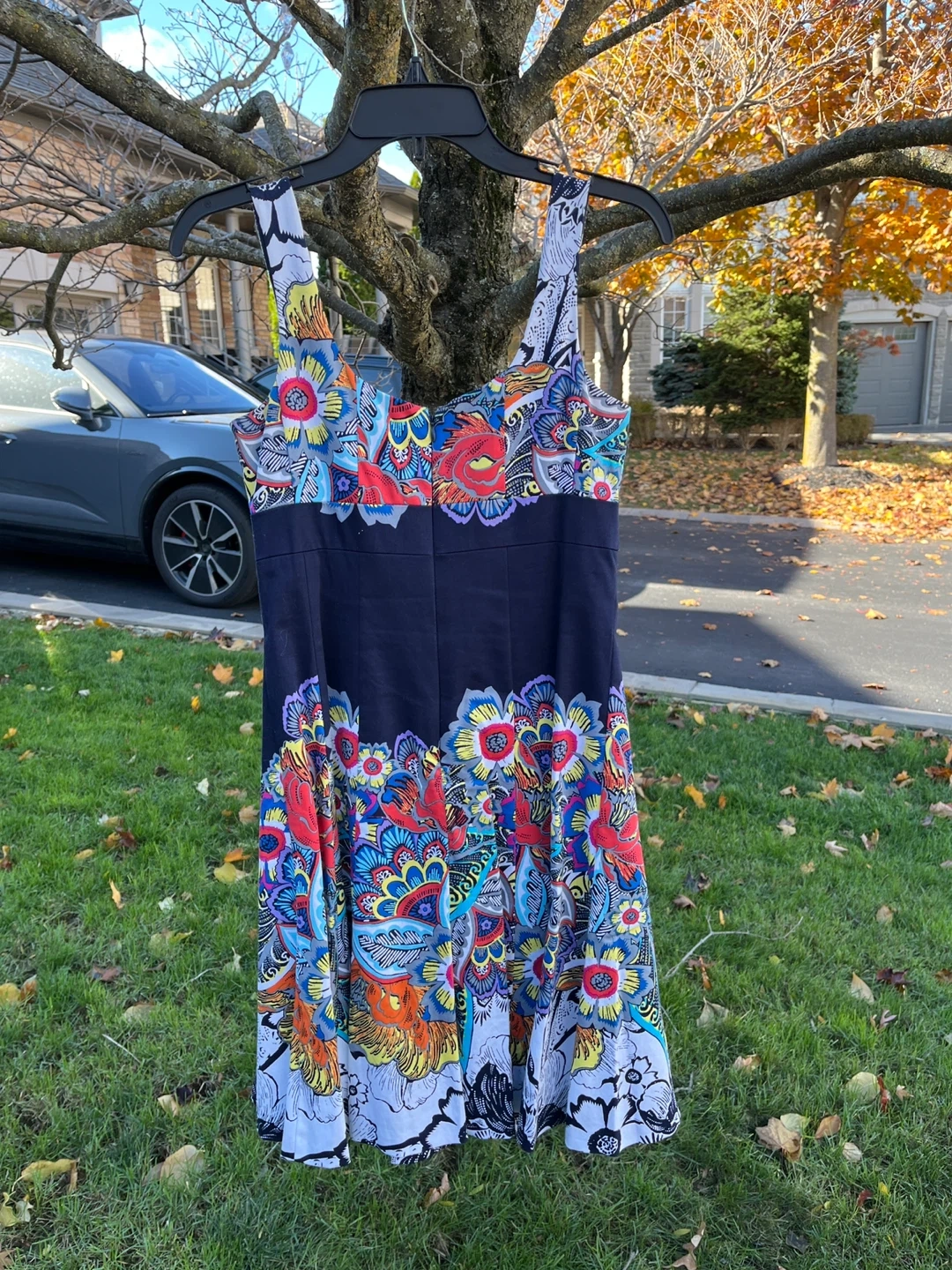 Selling a beautiful Nine West dress in size 2. It features a vibrant floral pattern on a navy background. Perfect for a special occasion or a fun day out!