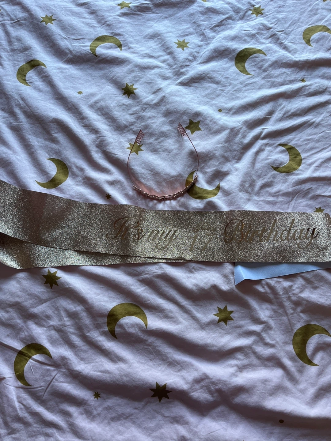 Sparkly gold sash and a rose gold tiara with '17' detailing. Perfect for a 17th birthday celebration. This set includes a decorative sash and a tiara to complete the festive look.