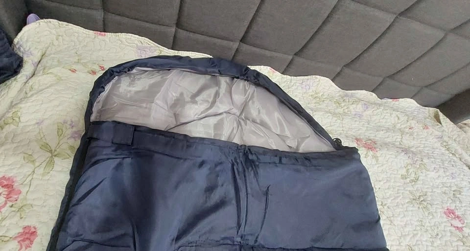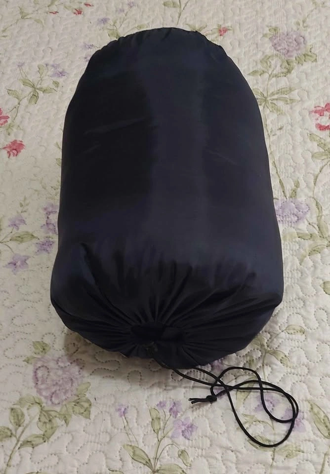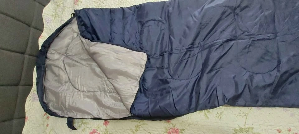 Like new sleeping bag, bought as a spare and never used. Includes compression bag. Photos taken on queen-size 6'x6.5' bed. Bought from Amazon for $30 new. Surface material is 230T polyester with hollow cotton filler. Measures 190cm x 150cm with a separated bottom zipper. Package size is 37cm x 27cm. It is quite lightweight and withstands weather from 5℃ to 35℃.