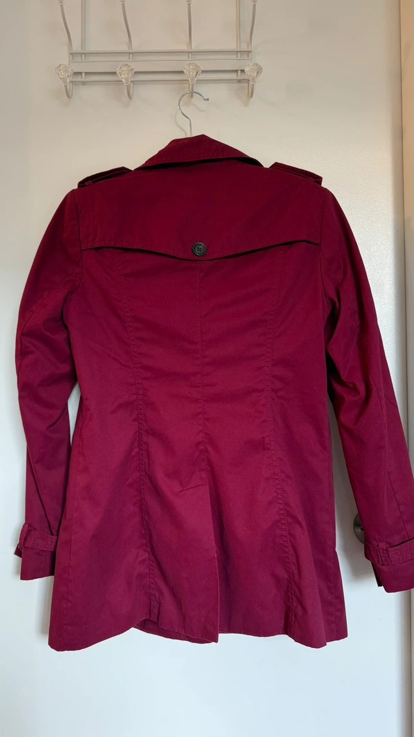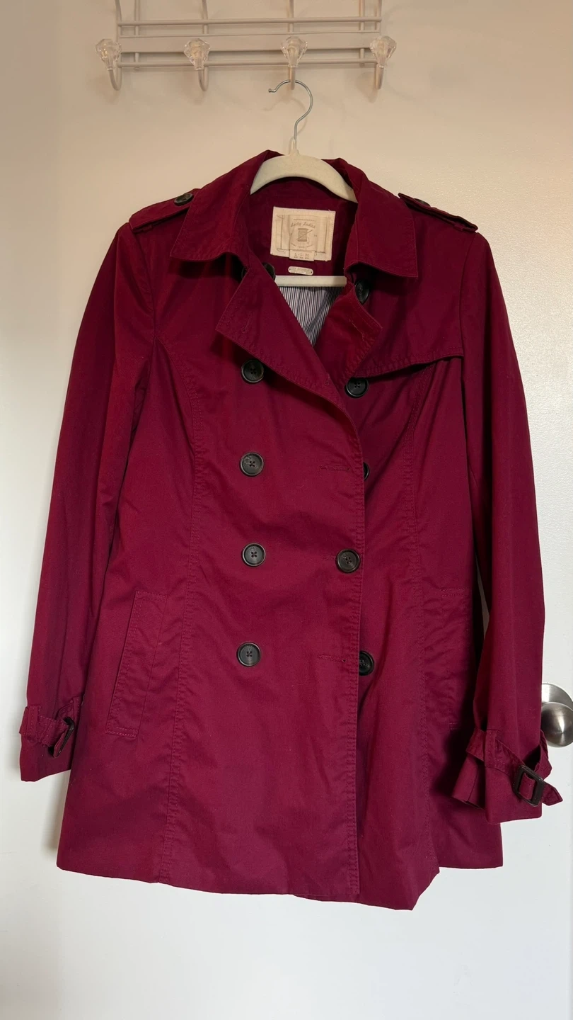 Classic women's double-breasted trench coat in a rich burgundy colour. It features epaulettes and adjustable cuffs. This stylish outerwear is perfect for transitional weather.