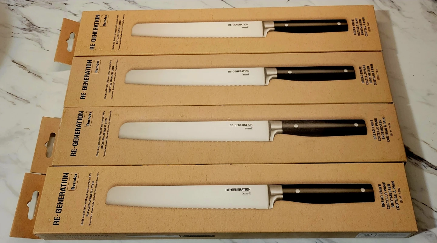 Set of four Berndes RE-GENERATION bread knives. Blades and bolsters are made with 98% recycled stainless steel. Each knife is 19cm (7.4 inches) long. They're perfect for slicing through crusty bread! Each is selling for $50