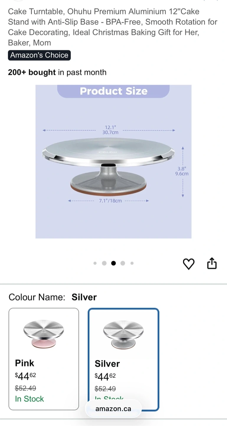 Selling a Premium Aluminium 12" Cake Stand with Anti-Slip Base! It has a smooth rotation for cake decorating. Perfect for any baker! The dimensions are 12.1" x 3.8". Originally bought for $44 plus tax.