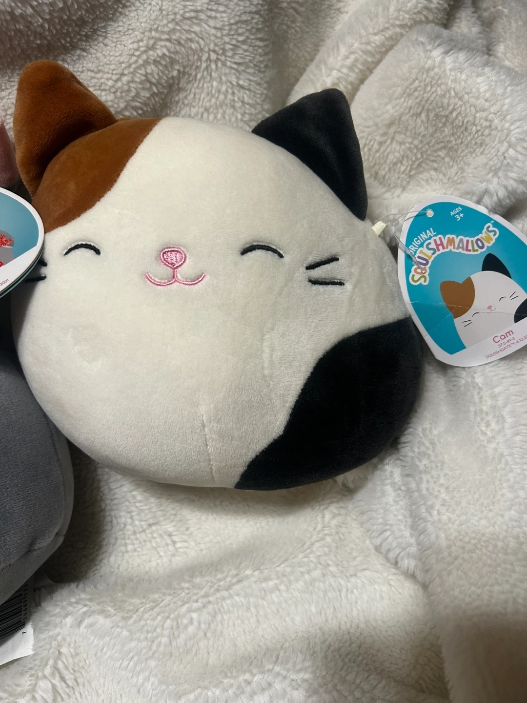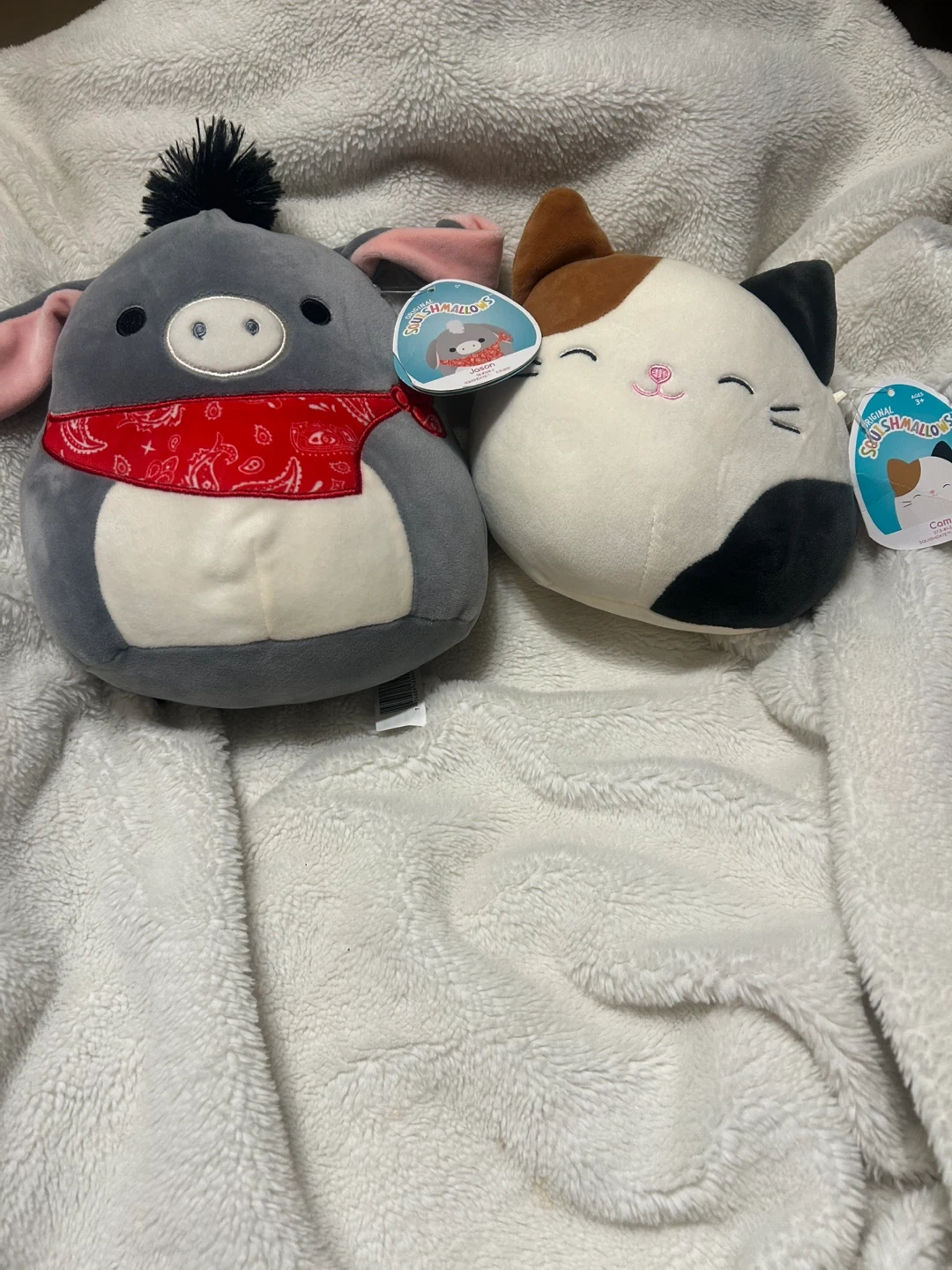 Selling two adorable Squishmallows plushies! There's Jason, the grey donkey with a red bandana, and Com, the cute calico cat. Both are new with original tags