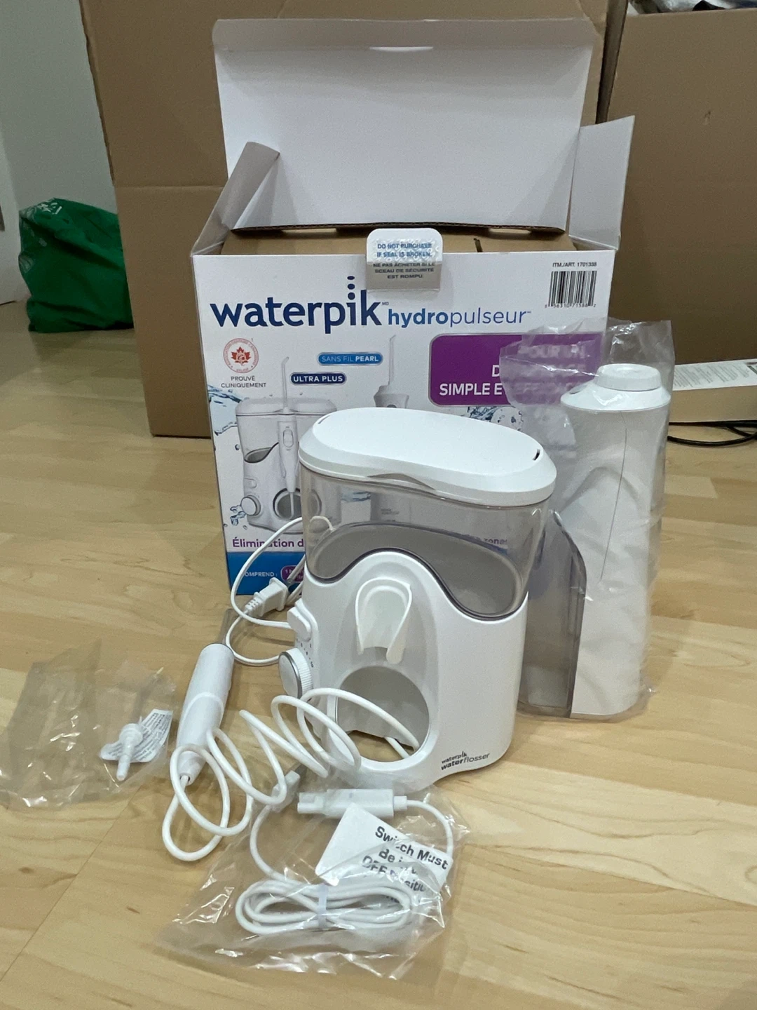 This is a Waterpik HydroPulseur Ultra Plus cordless water flosser in pearl colour. It includes various tips and accessories for oral hygiene. This water flosser is designed for effective dental care at home.