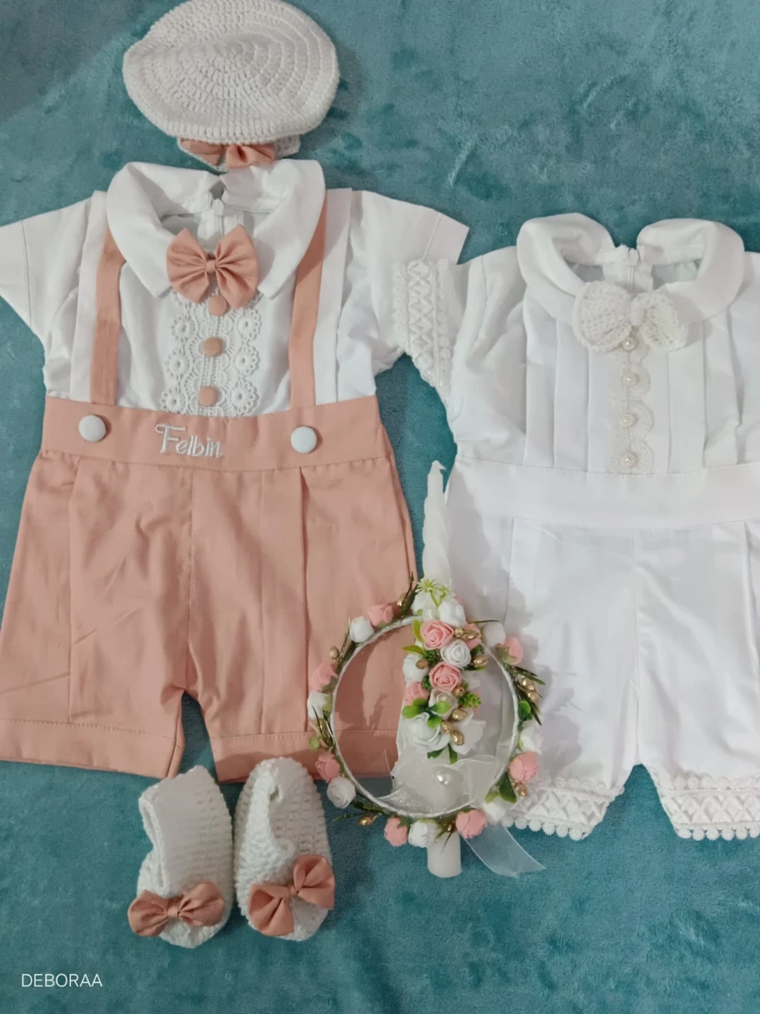 Two christening outfits for baby boys, one in white and one peach with white suspenders. Both outfits include a matching cap and booties. Perfect for special occasions!