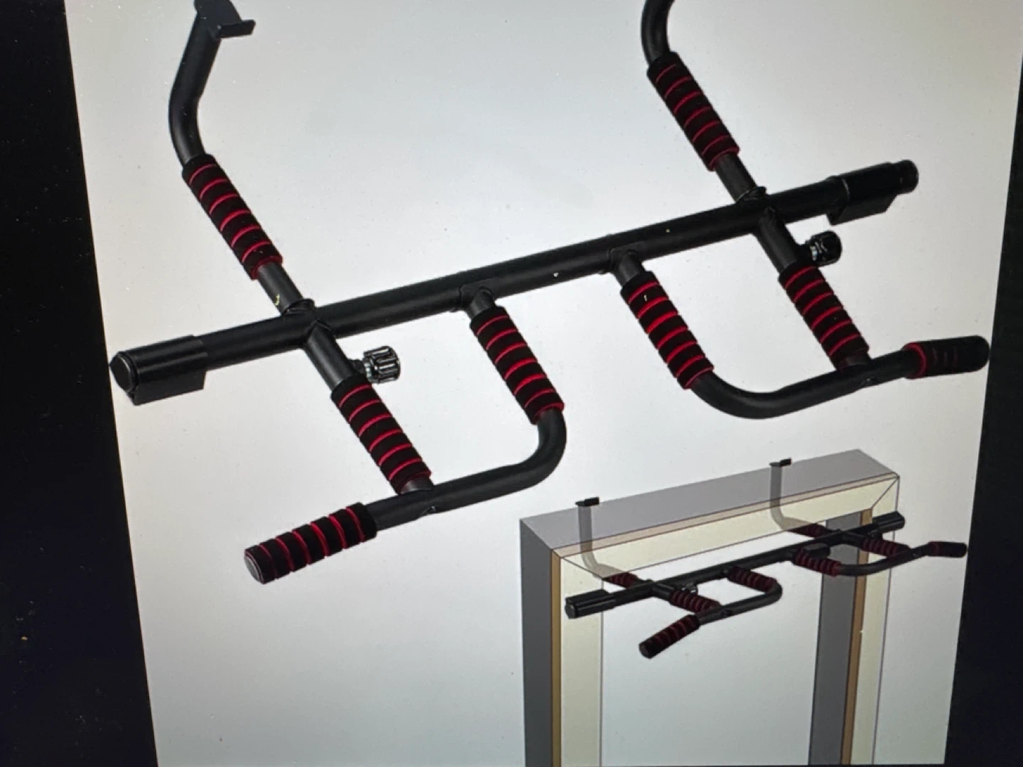 This doorway pull-up bar offers multiple grip options for varied workouts. It features black metal construction with red, padded grips. Easy to set up for home fitness routines. Perfect for strengthening upper body muscles.