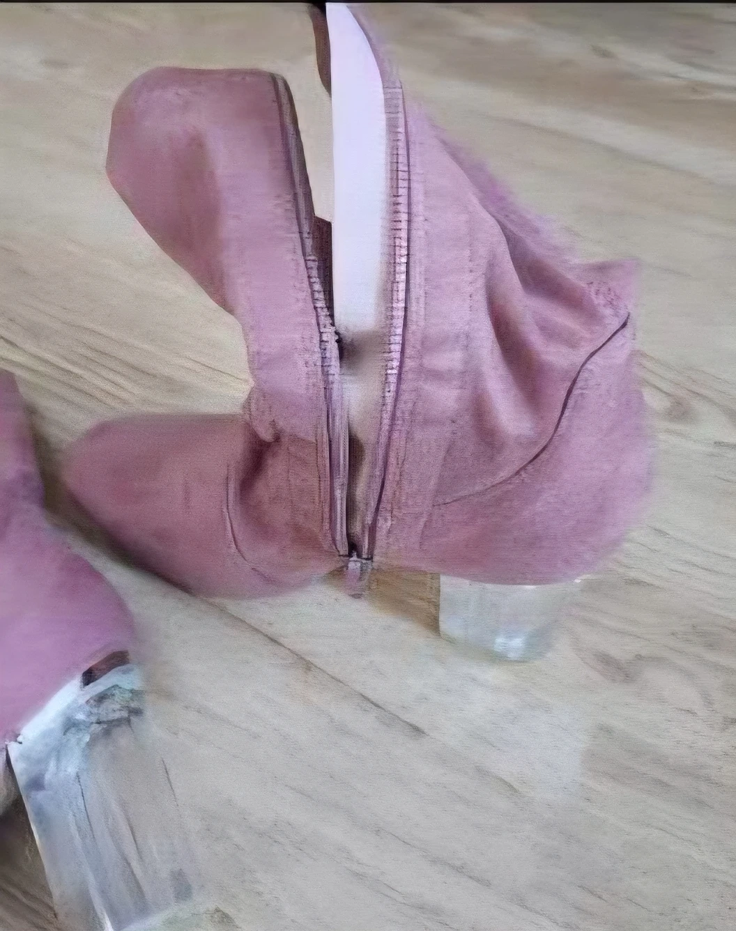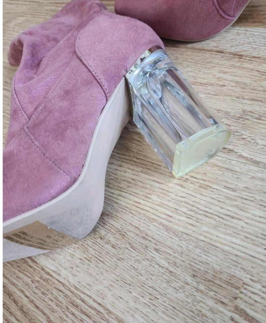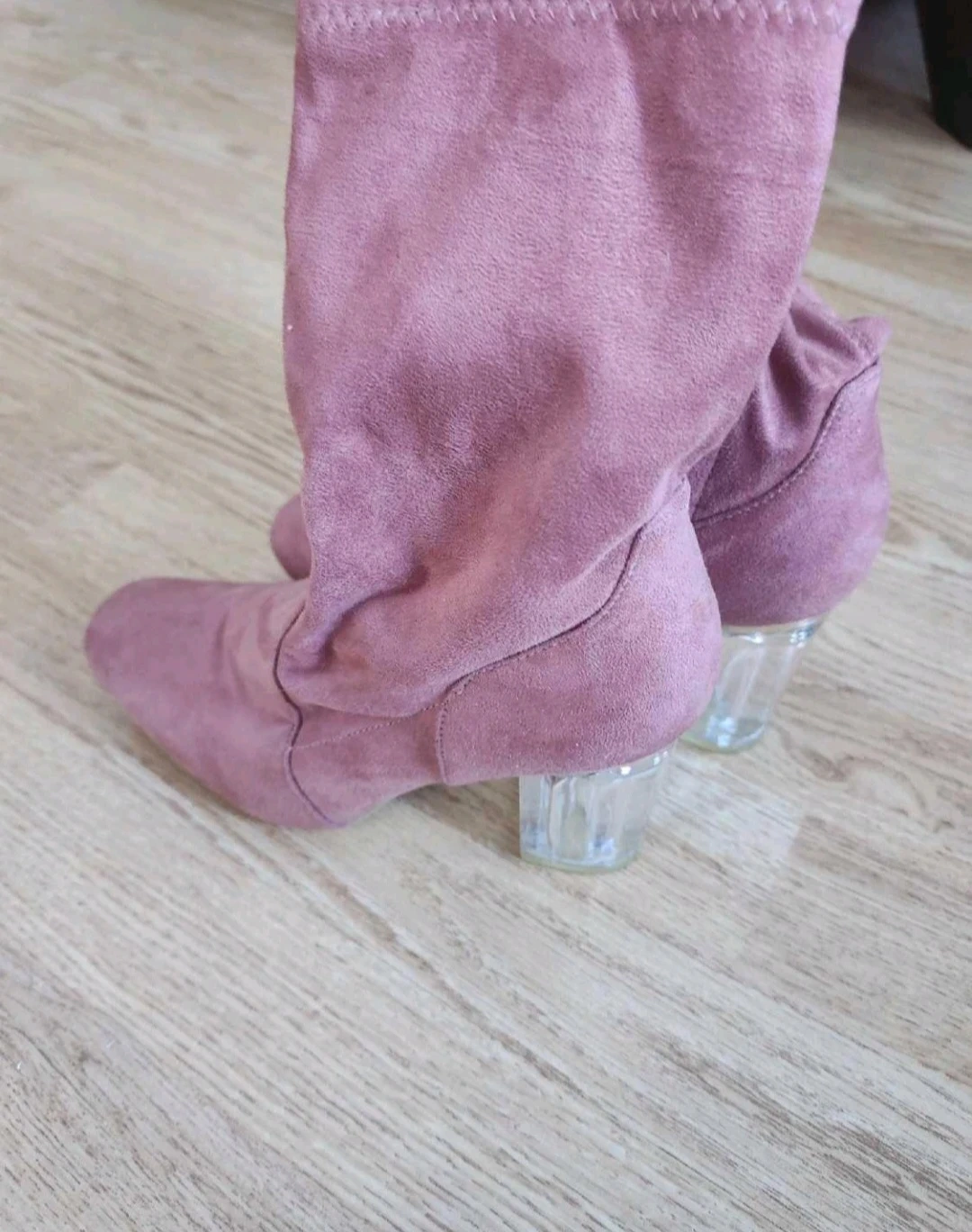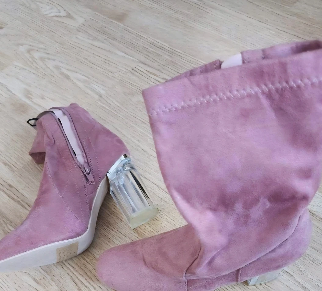 Pink ankle boots with a faux suede finish and a trendy clear block heel. They feature a side zipper for easy wear. Perfect for adding a stylish touch to your outfits!