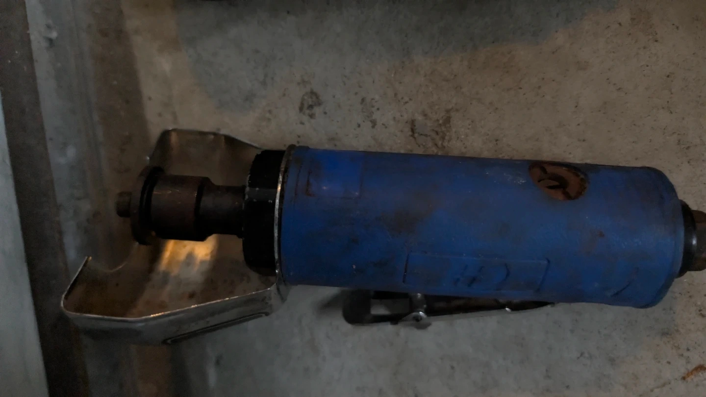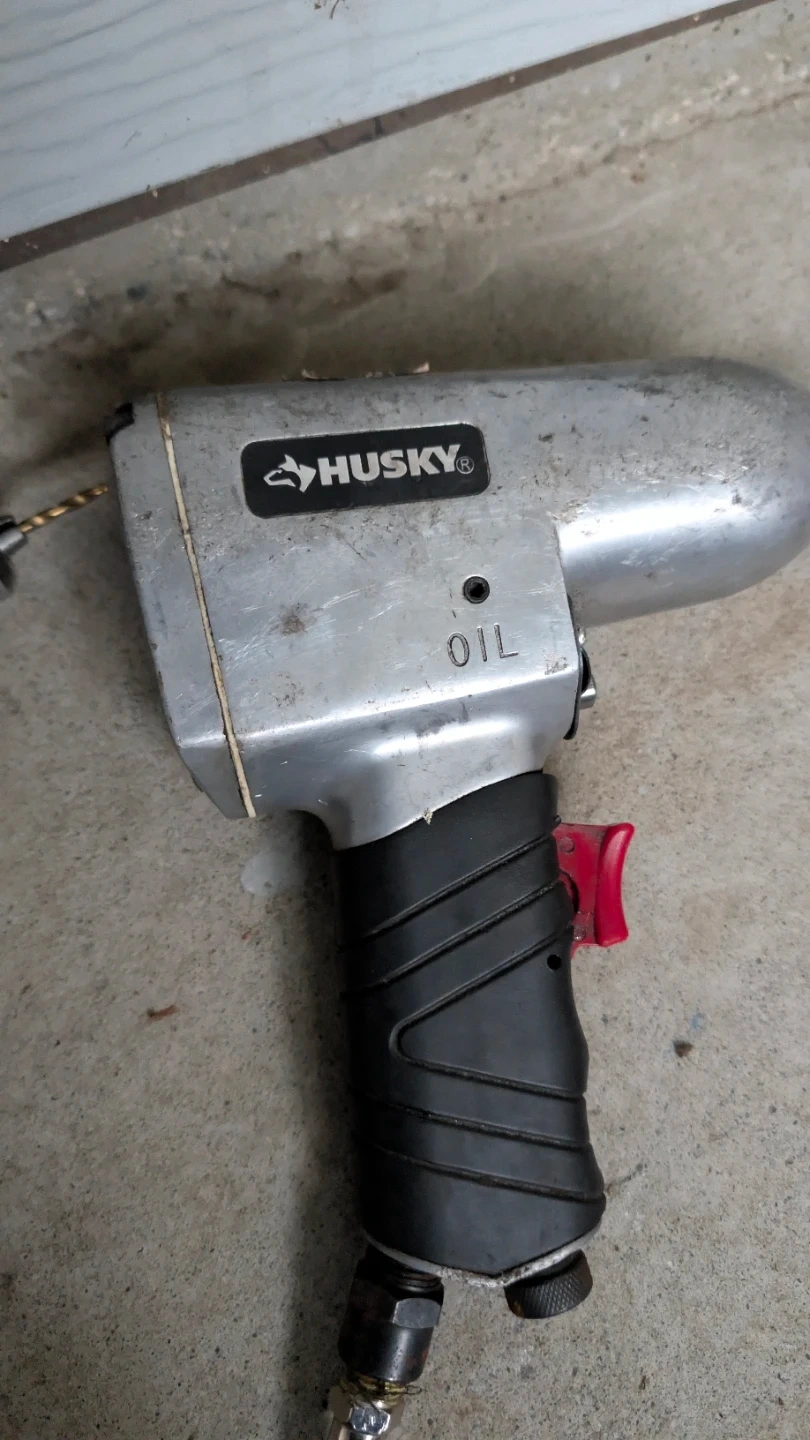 Campbell Hausfeld 100 PSI compressor, pneumatic grease gun, Husky impact gun, Husky air drill, blue air die grinder, small Husky straight air die grinder (inline), 25 ft red air hose, and fittings.