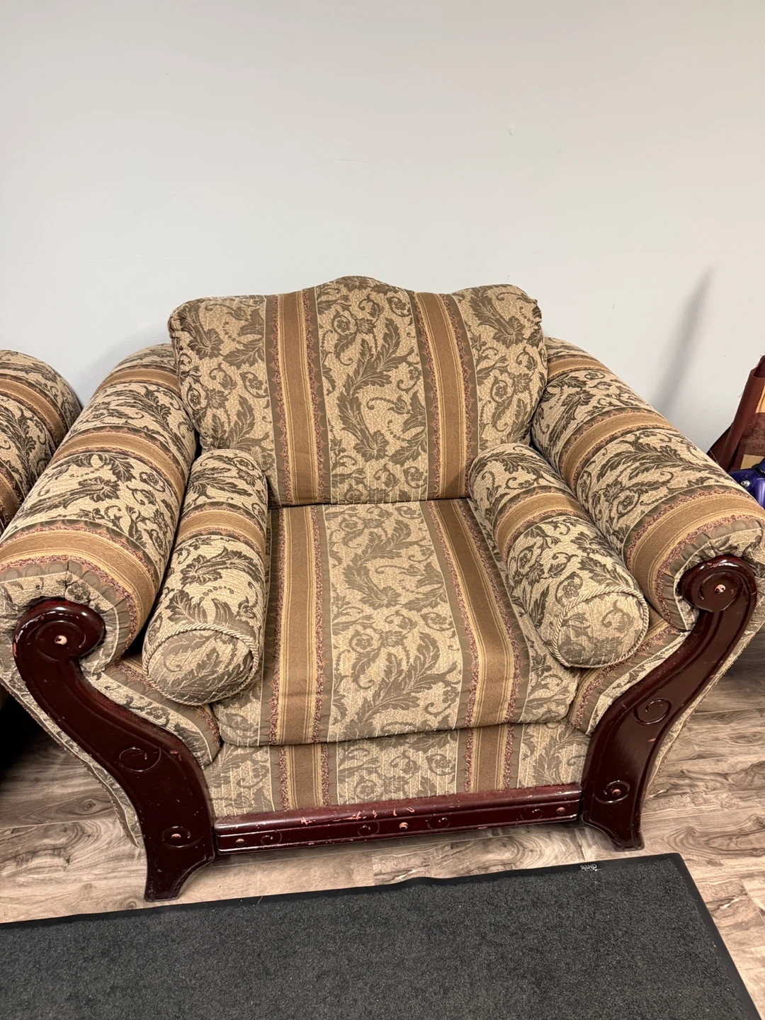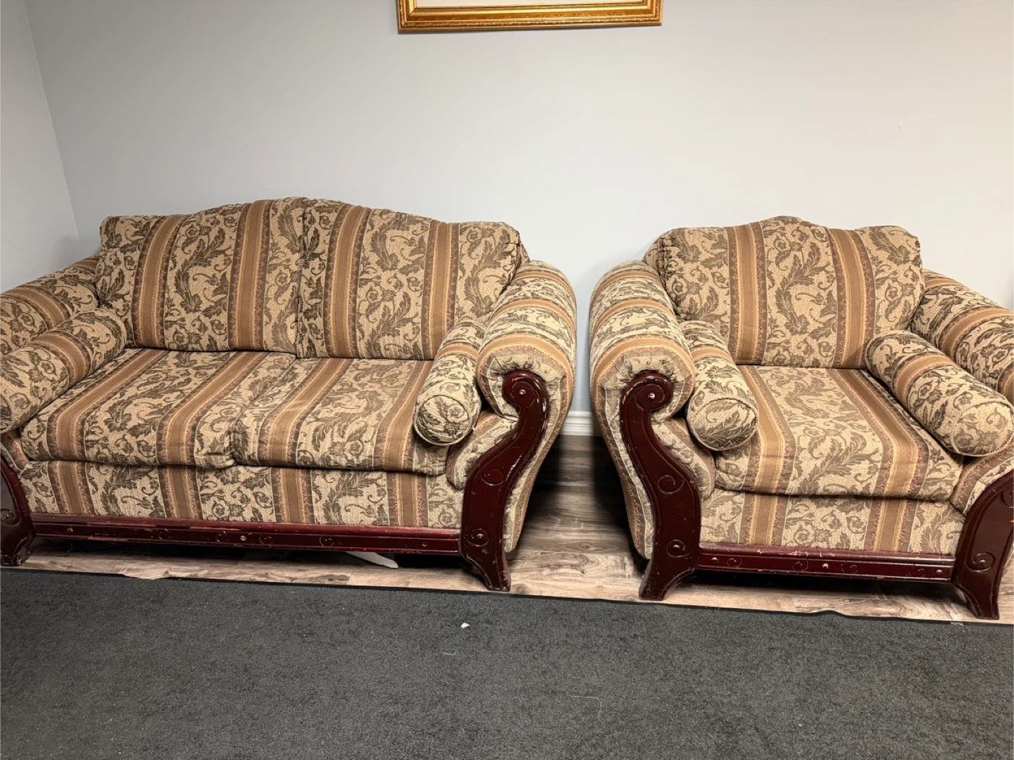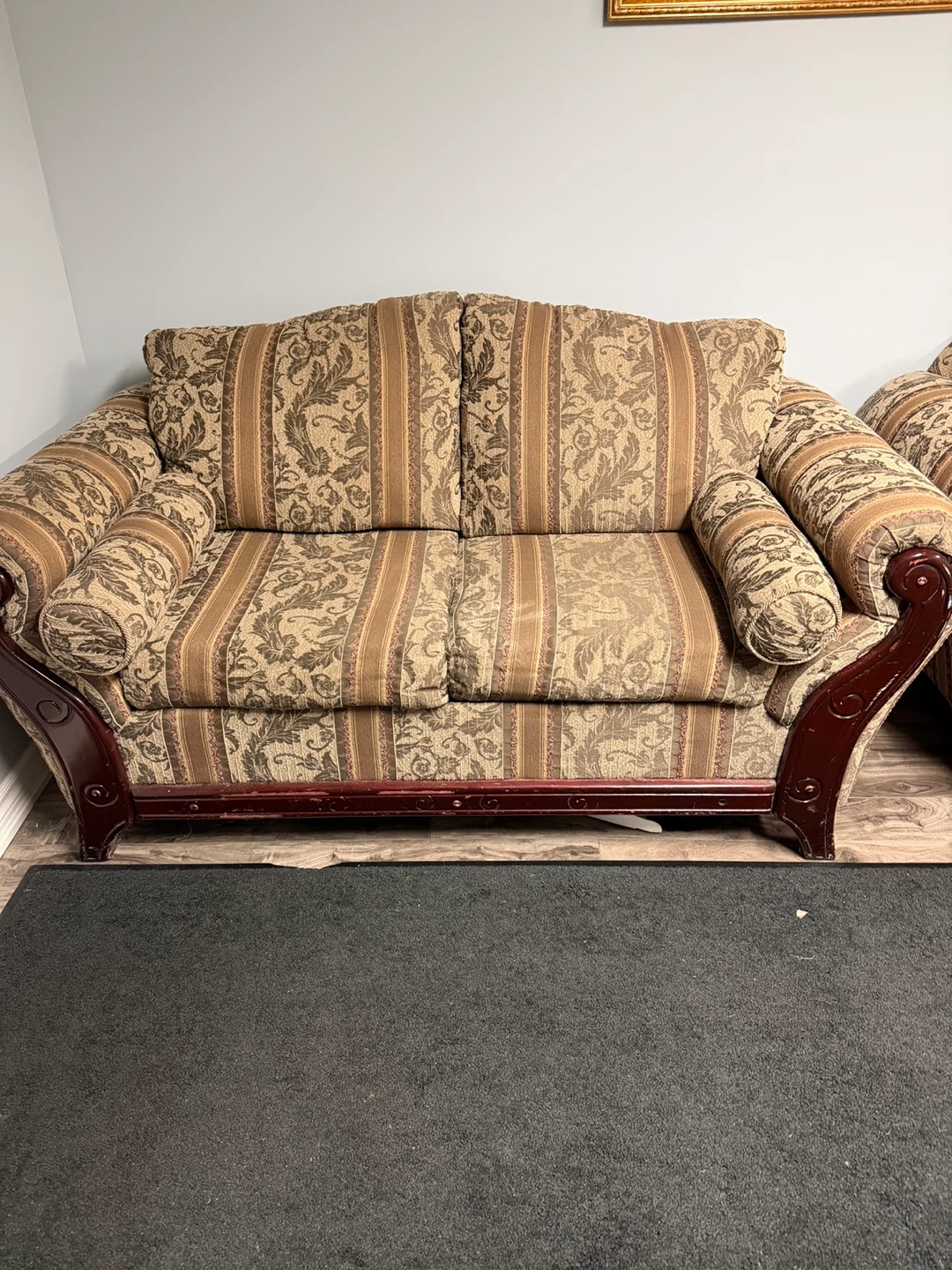 This fabric loveseat features a traditional damask-style pattern in brown and beige tones. It has rolled arms and ornate dark wood trim along the base and arms. Perfect for a living room or den, along with sofa chair.