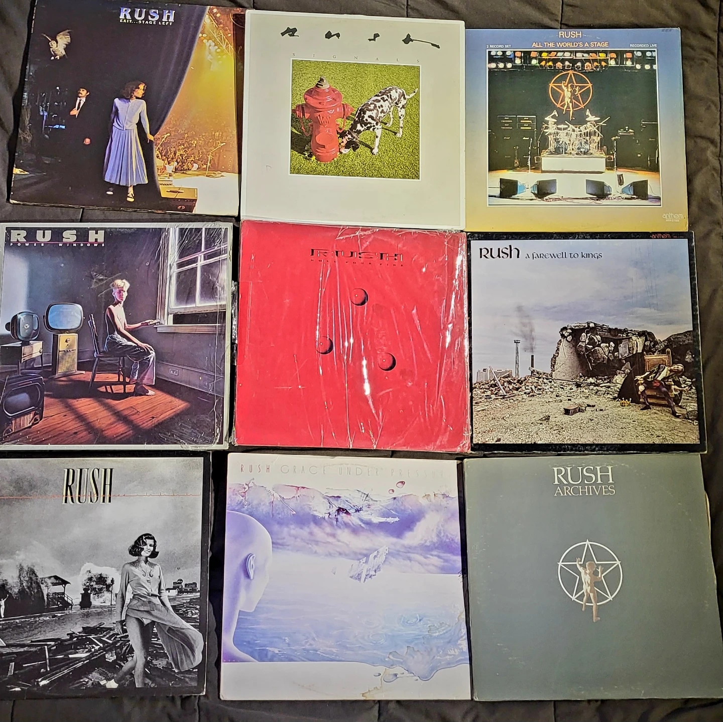 Includes the albums; Archives, Power Windows, All The World's A Stage, Signals, Permanent Waves, Hold Your Fire, Grace Under Pressure, A Farewell To Kings & Exit Stage Left . These are original vinyls in original packaging. Excellent condition.