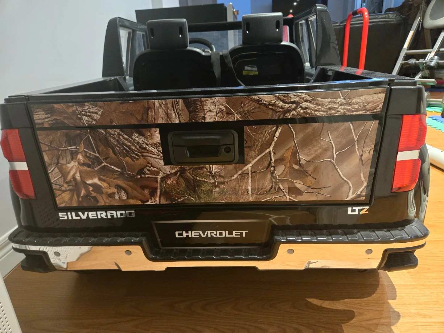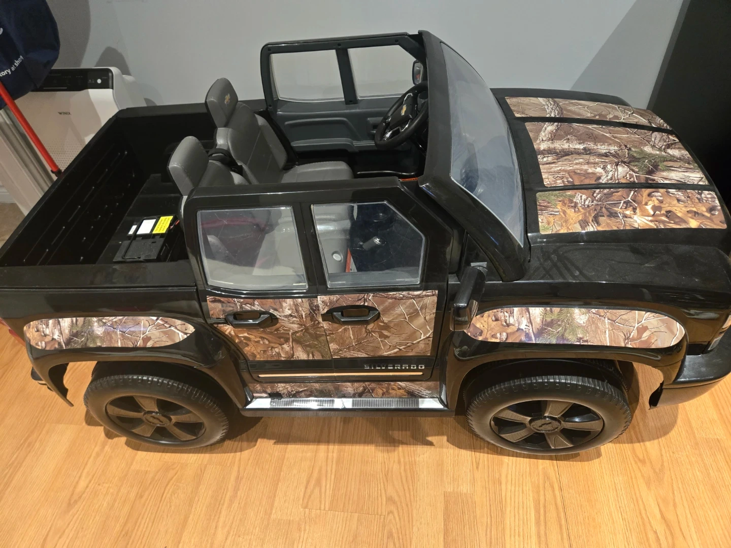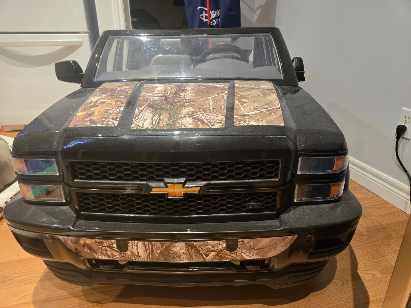 This is a Chevrolet Silverado LTZ ride-on truck for kids. It's black with camouflage accents on the hood, doors, and tailgate. It features realistic details like a steering wheel and seats. Has a battery and charger. Has 2 seating capacity and trunk. Pretty big. $300 obo.