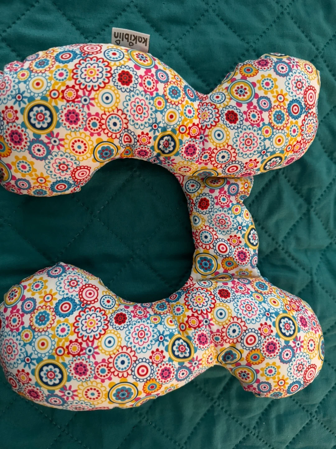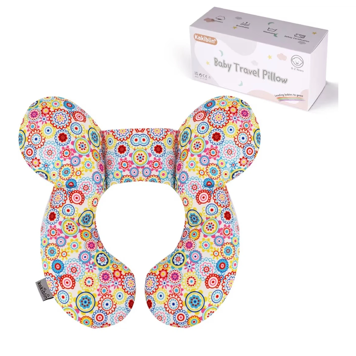This Kakiblin baby travel pillow features a cute, colourful floral pattern. It's designed for babies aged 0-2 years. Great for keeping little ones comfy on the go!
