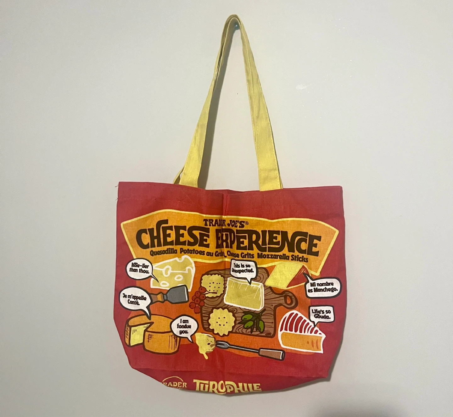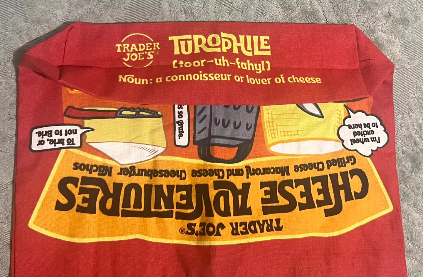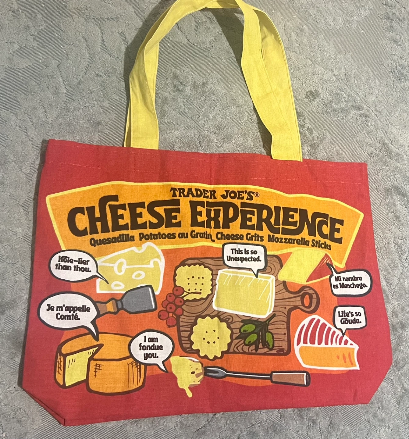 This is a Trader Joe's "Cheese Adventures" tote bag. It's made of red fabric with yellow handles. The bag features various cheese-themed graphics and text.
