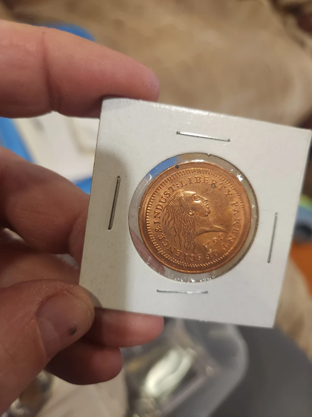 This is a token medallion from Coin Galleries of Oyster Bay. It's made of copper. The front shows a profile and text reading 'Industria, Liberty, Prudentia, Scientia'. The back lists the gallery's address and phone number.
