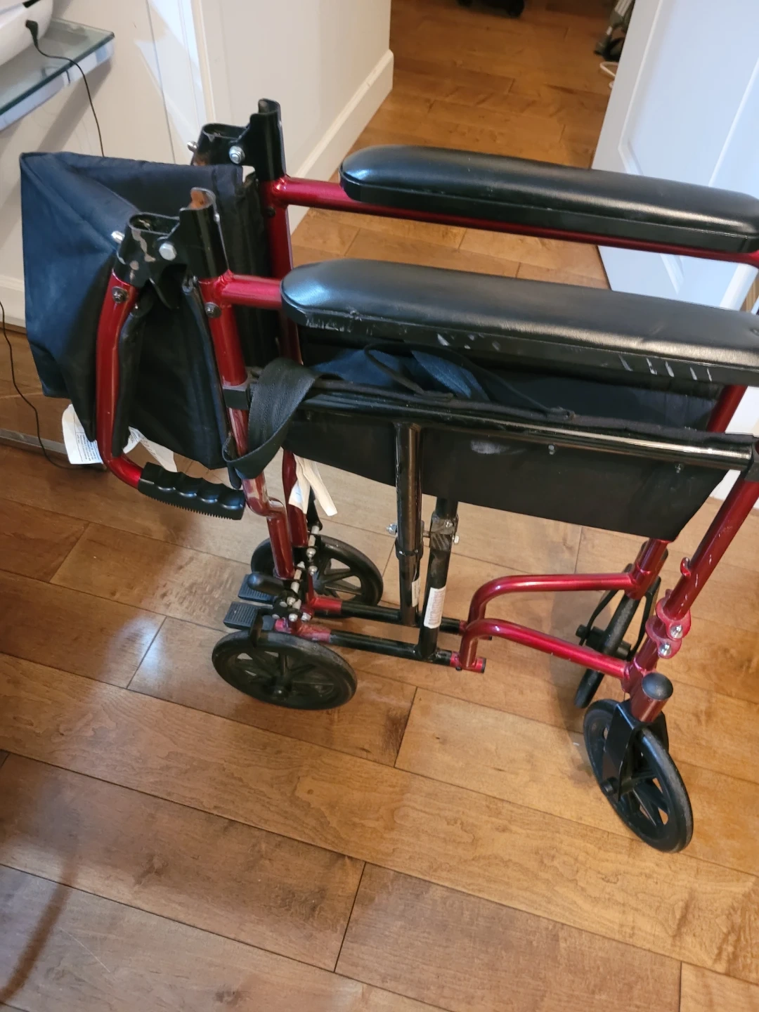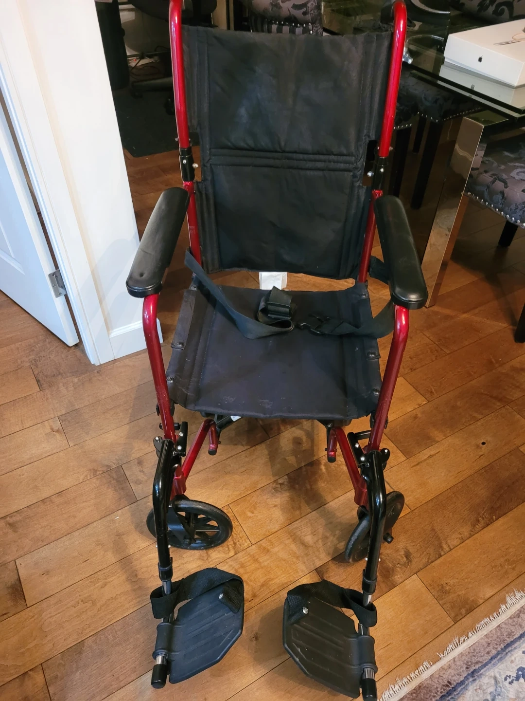This is a Nova lightweight transport wheelchair. It's red and black with a seatbelt. The chair features padded armrests and footrests. It's foldable for easy transport.