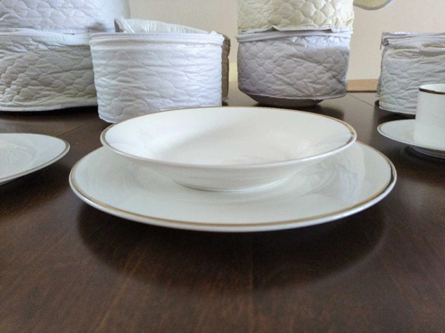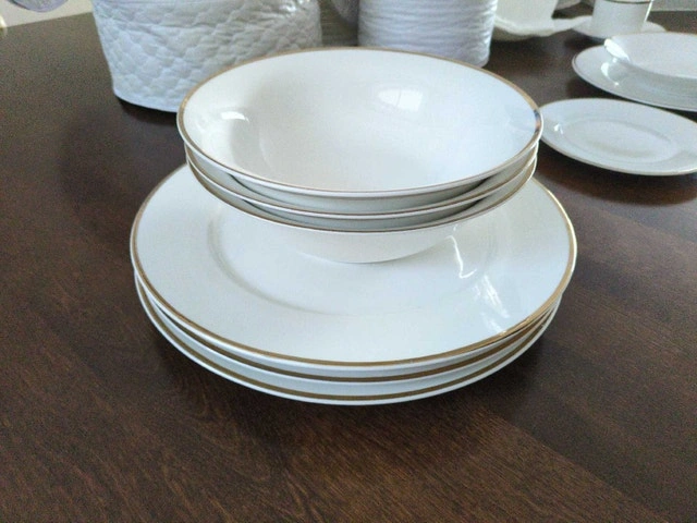Includes dinner plate, bowl, dessert plate, small plate/saucer for each setting, plus 12 cups, 3 large serving plates, and 3 large serving bowls. Gold rimmed - ideal for sprucing up your dinner parties. Must go.