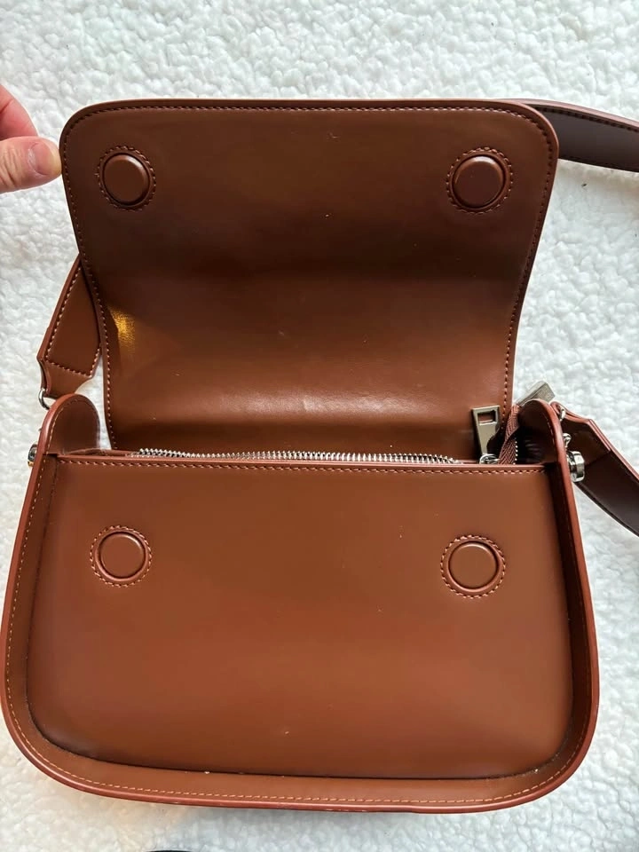 Medium-sized brown leather crossbody bag with a matte finish, perfect for everyday use. Features a zip and magnetic closure for security. Interior has a polyester/cotton lining with one main pocket, one inner pocket, and one inner zipper pocket. Bag measures approximately 6x3 inches. Made from split leather (second layer cowhide). Net weight is about 0.63 kg.