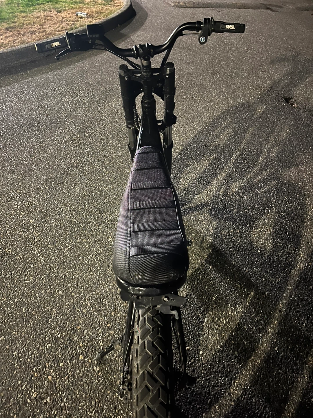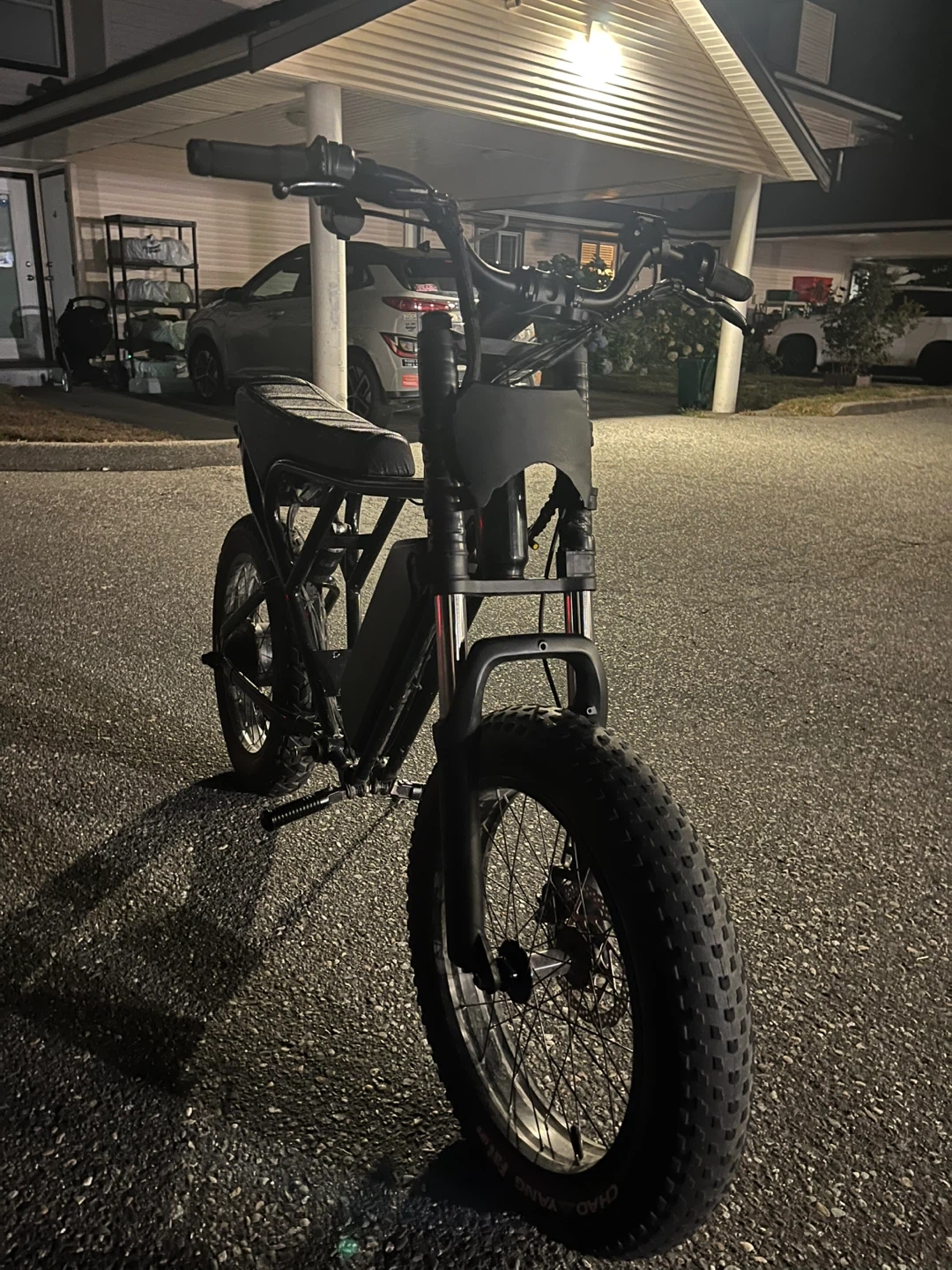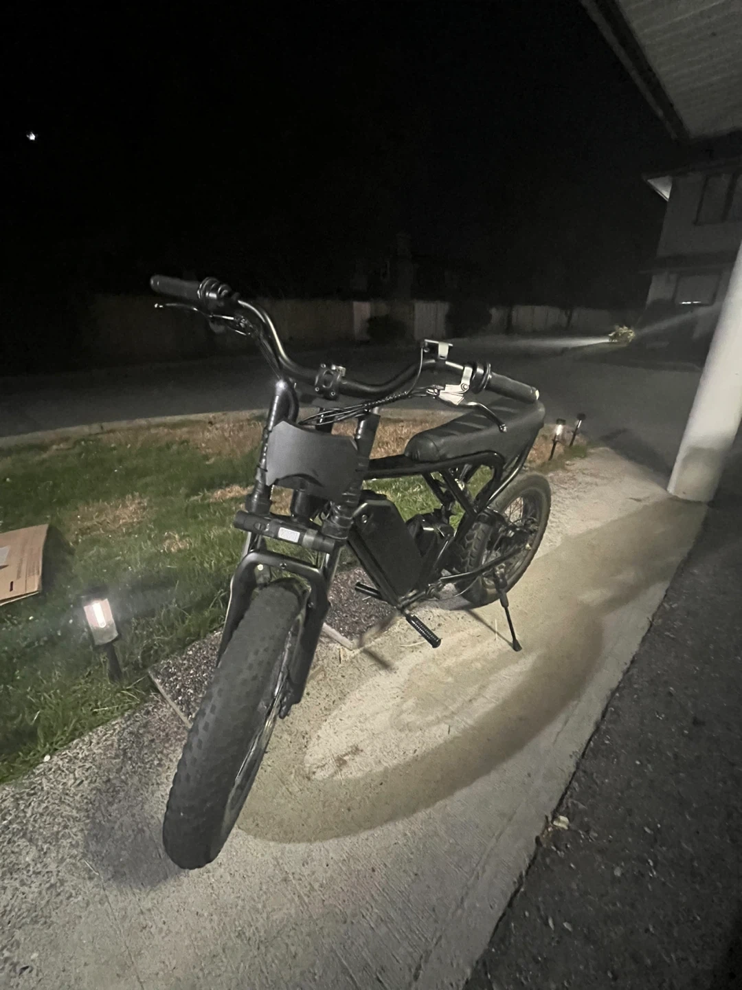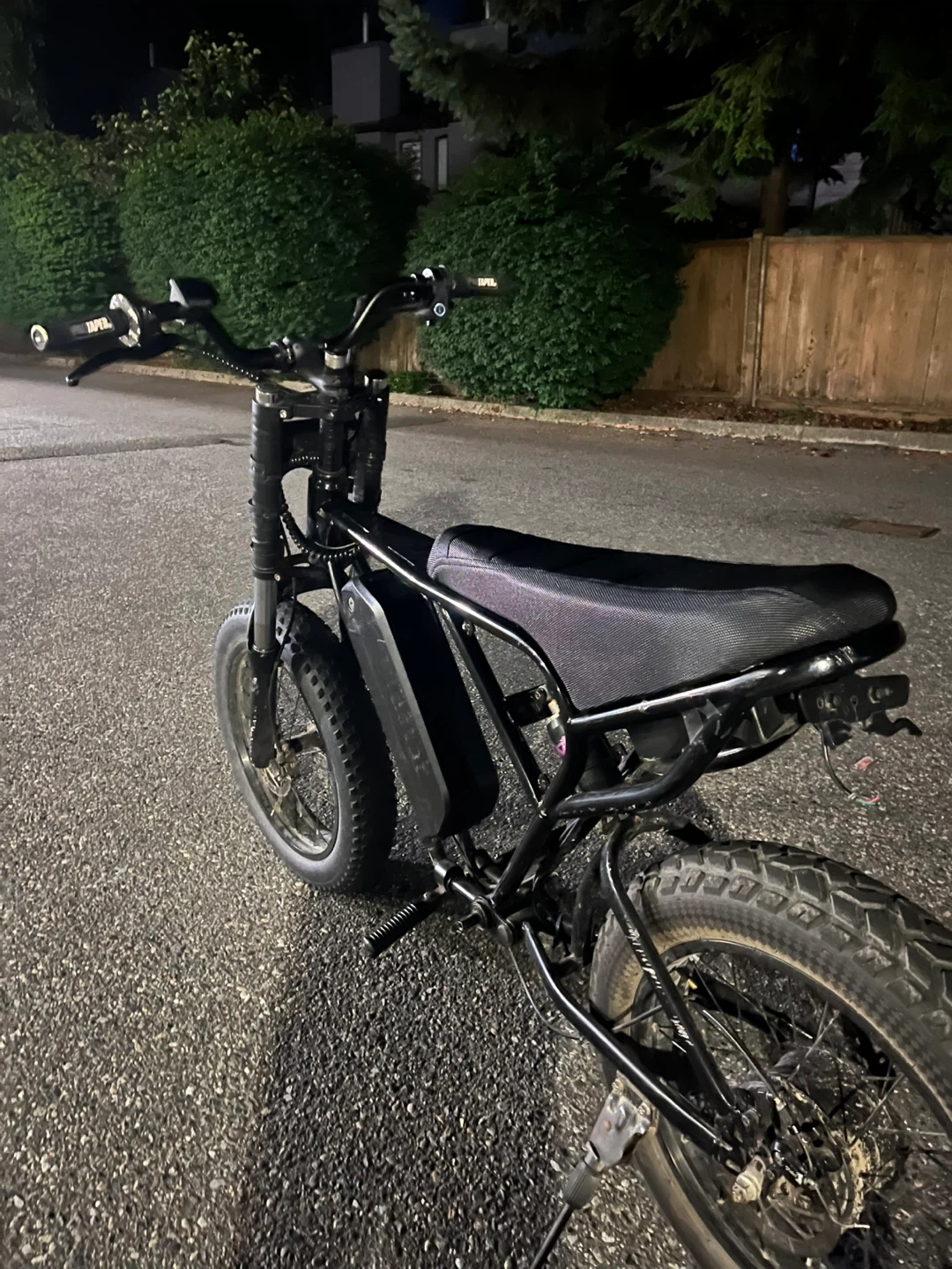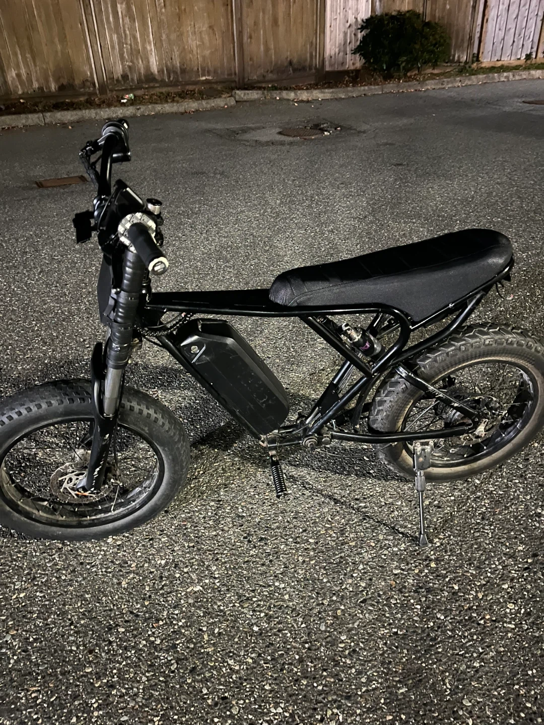 This is a black electric fat tire bike. It has a sturdy frame with a comfortable seat and thick tires. The bike is equipped with a battery pack and disc brakes for reliable stopping power.