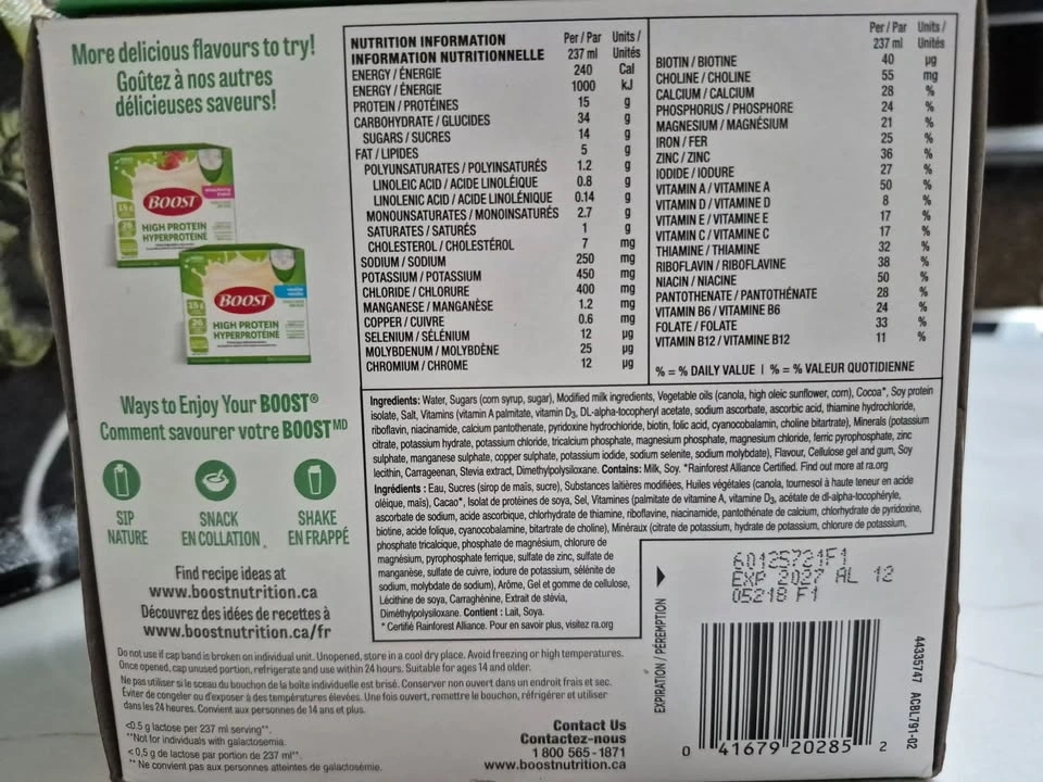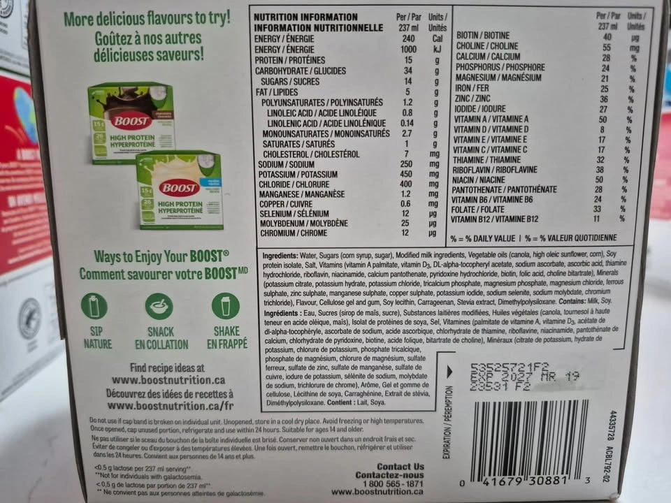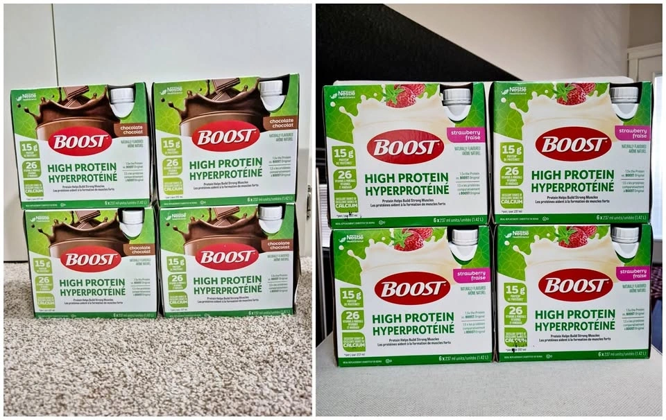 Selling 4 sealed boxes (24 bottles total) of Nestle Boost High Protein Meal Replacement Drinks. Available in Chocolate or Strawberry. Expiry dates are March 2027 for Strawberry and April 2027 for Chocolate.