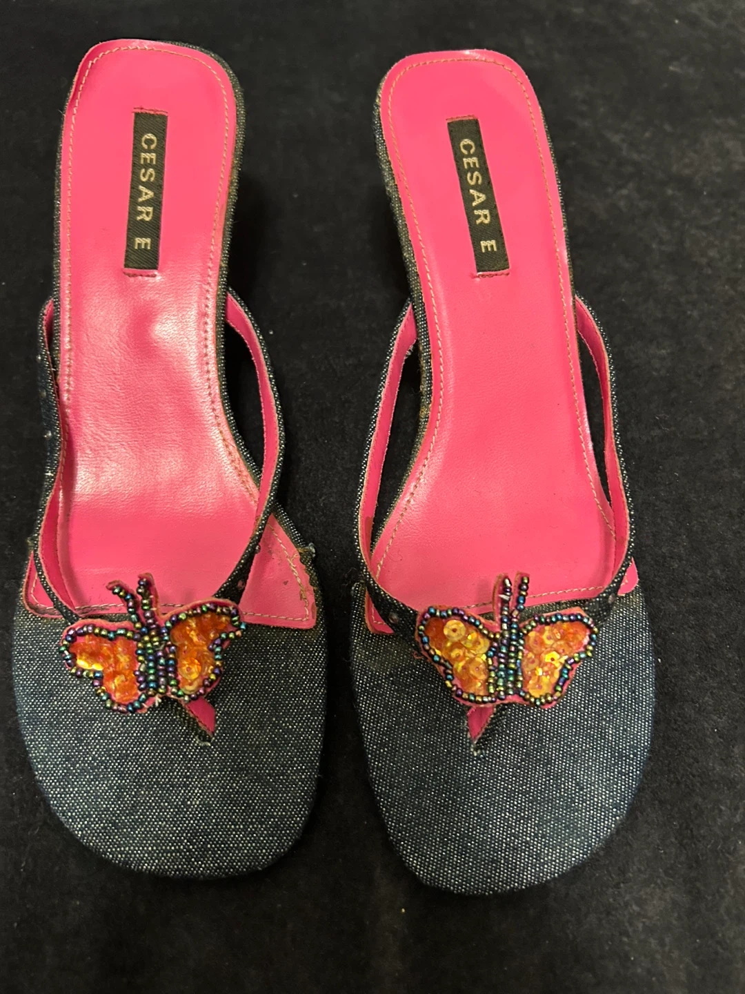Denim sandals feature a fun butterfly design with sequins and beads. They have a denim exterior and a bright pink interior. A stylish choice for any outfit!