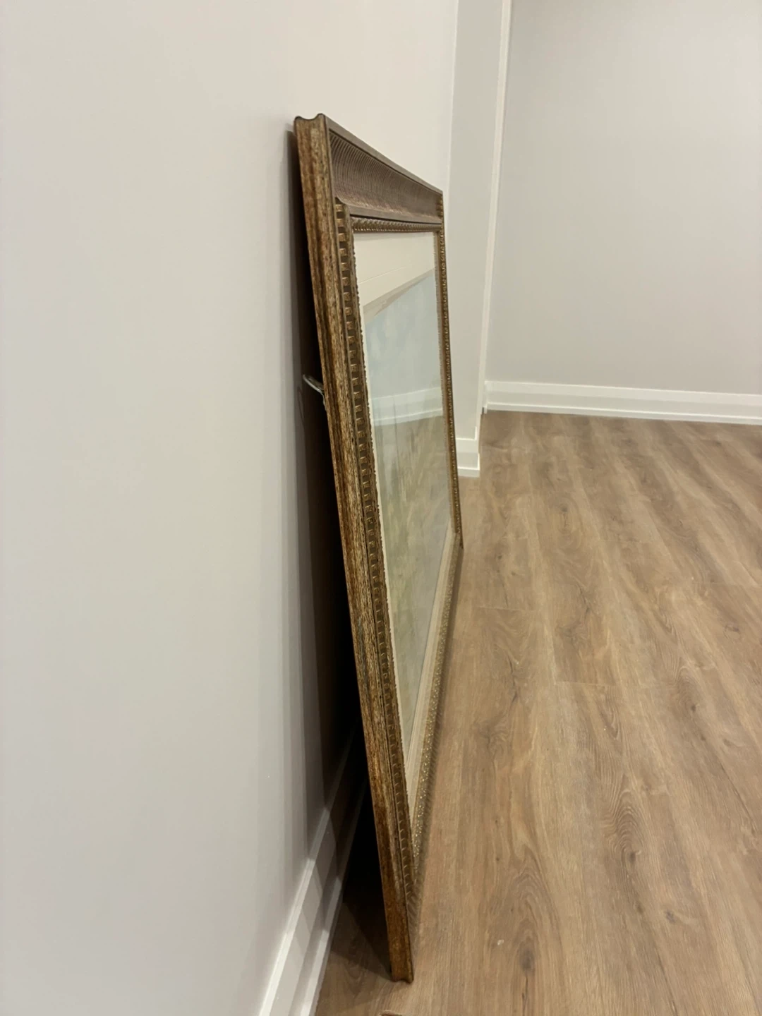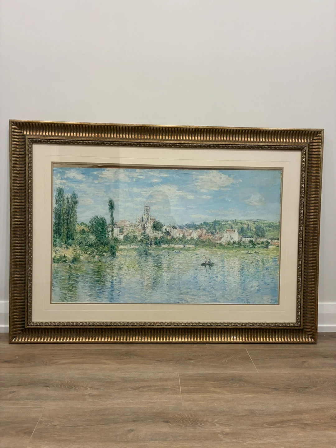 This framed painting depicts a scenic landscape featuring a village by a river under a cloudy sky. It's housed in an ornate gold-toned frame. The artwork has a classic, serene feel to it.