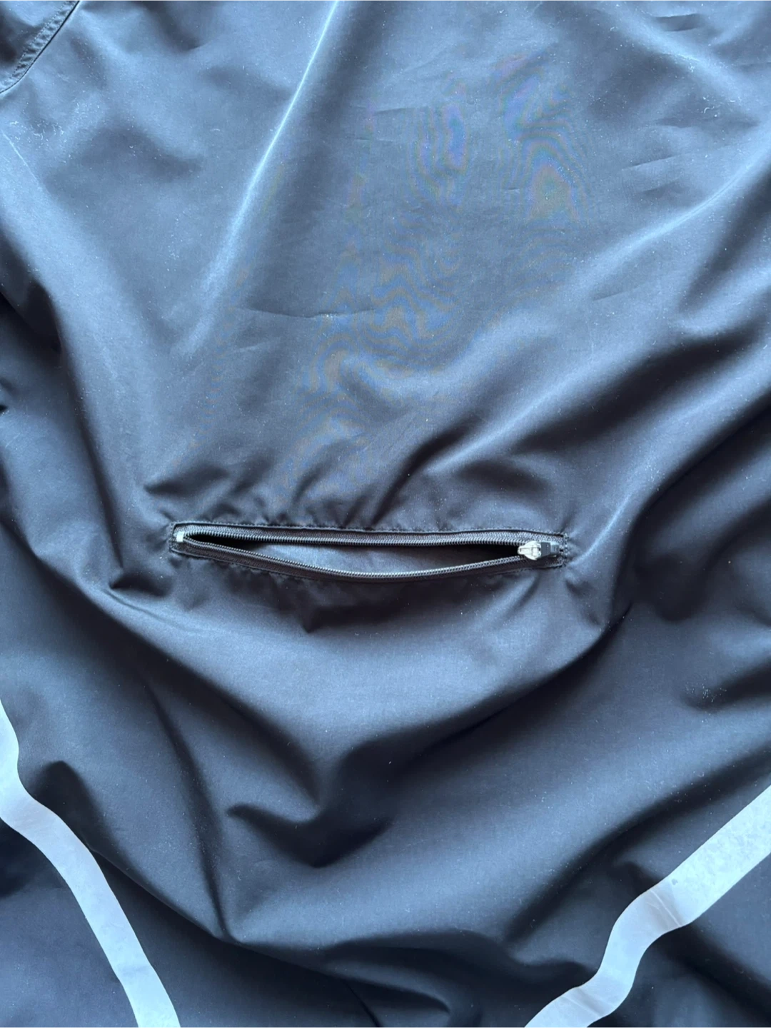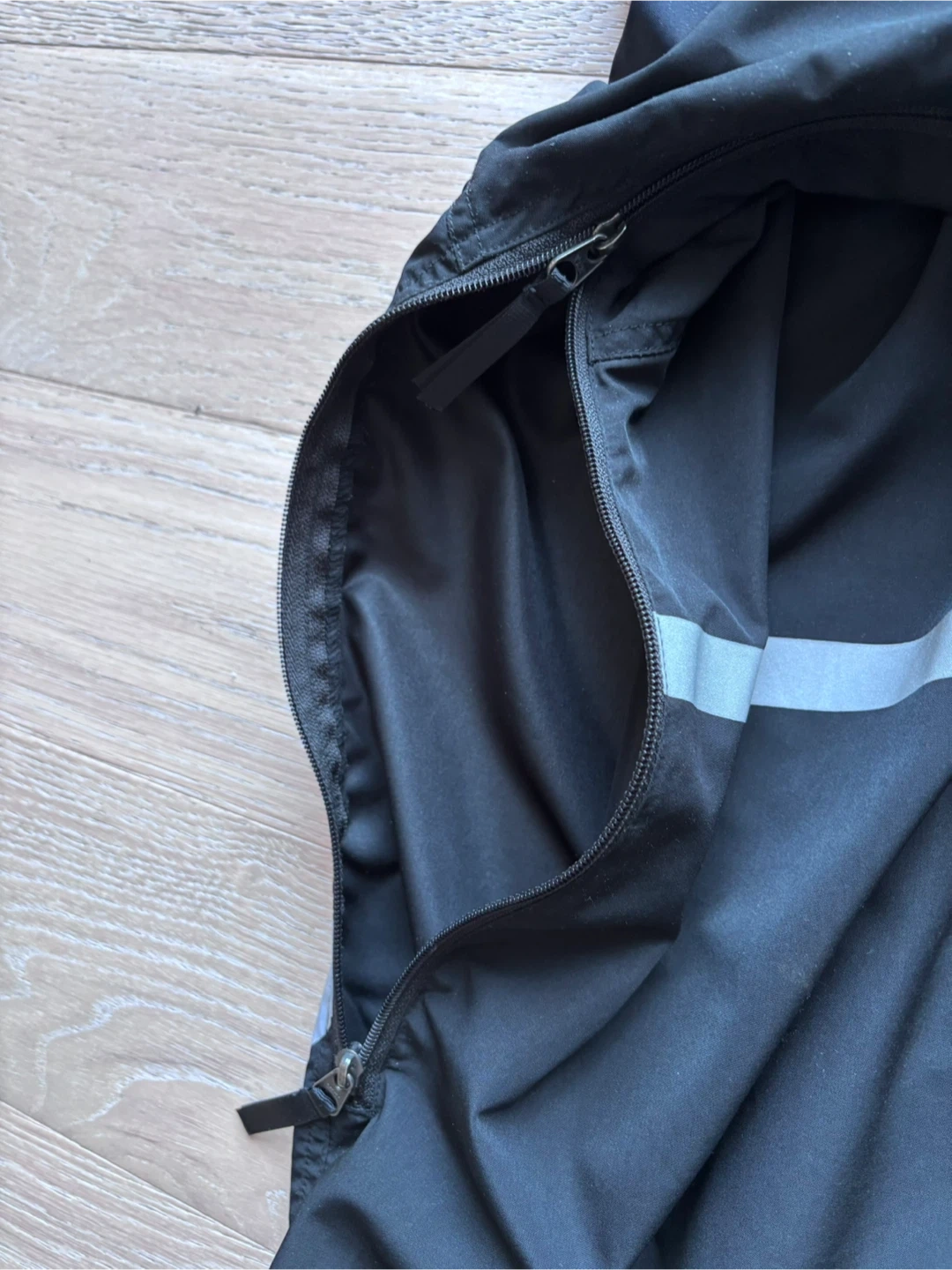 Large MEC jacket, tailored cut that fits over layers but doesn't billow in the wind when you're riding.