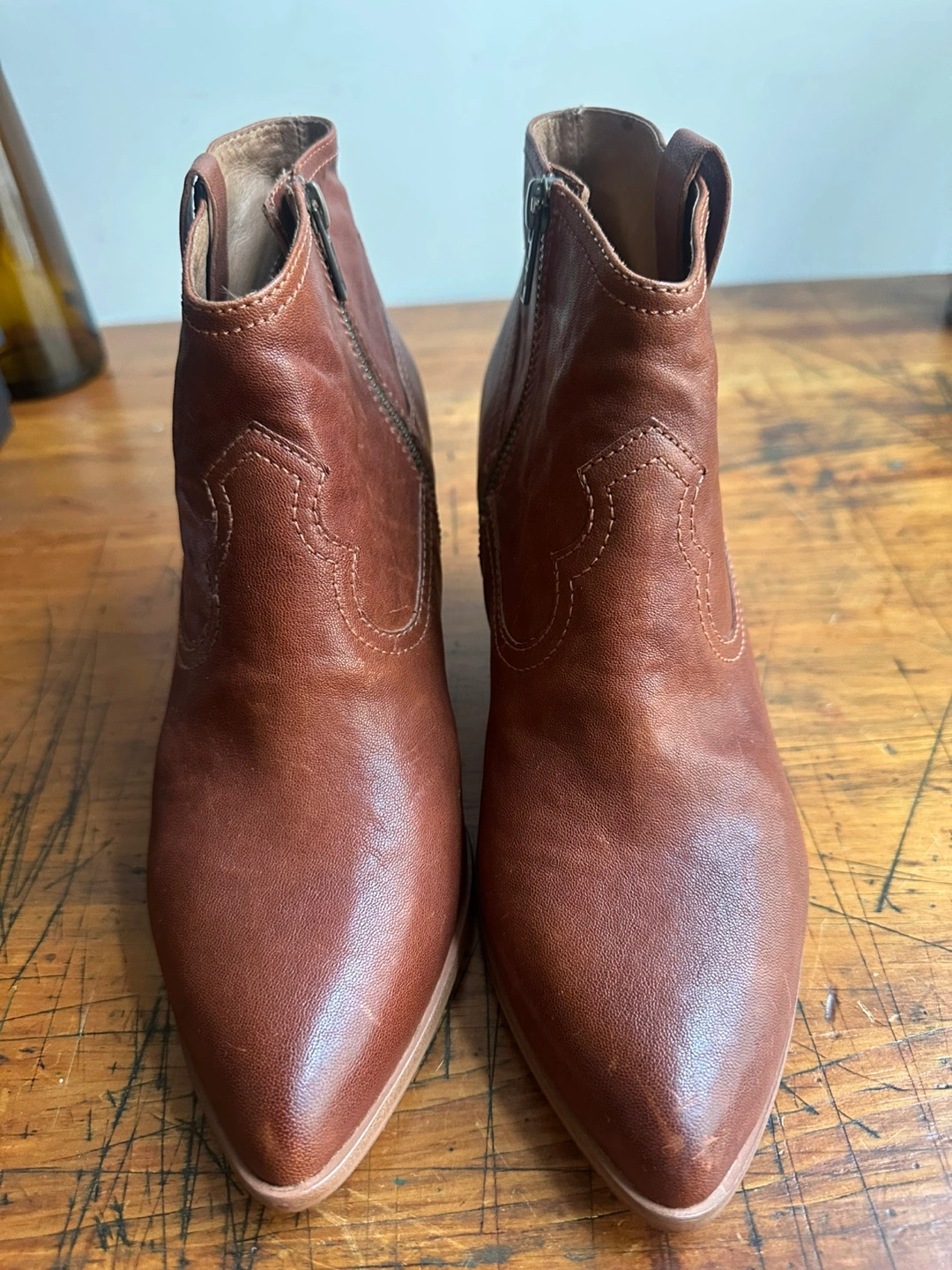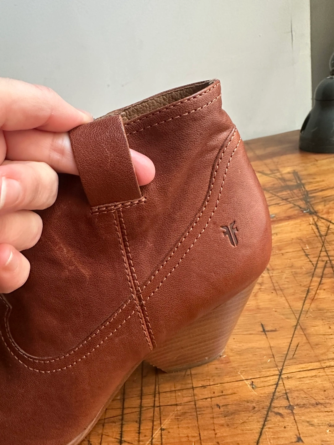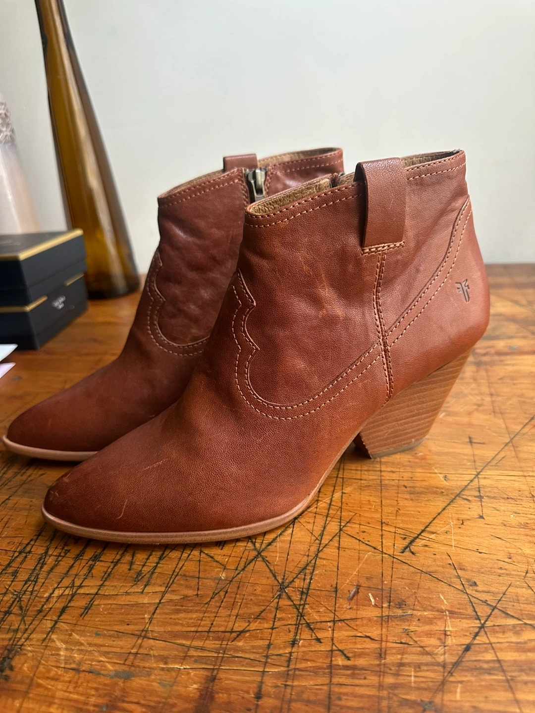 FRYE Reina Cognac Leather Stitch Detail Western Booties Size 10