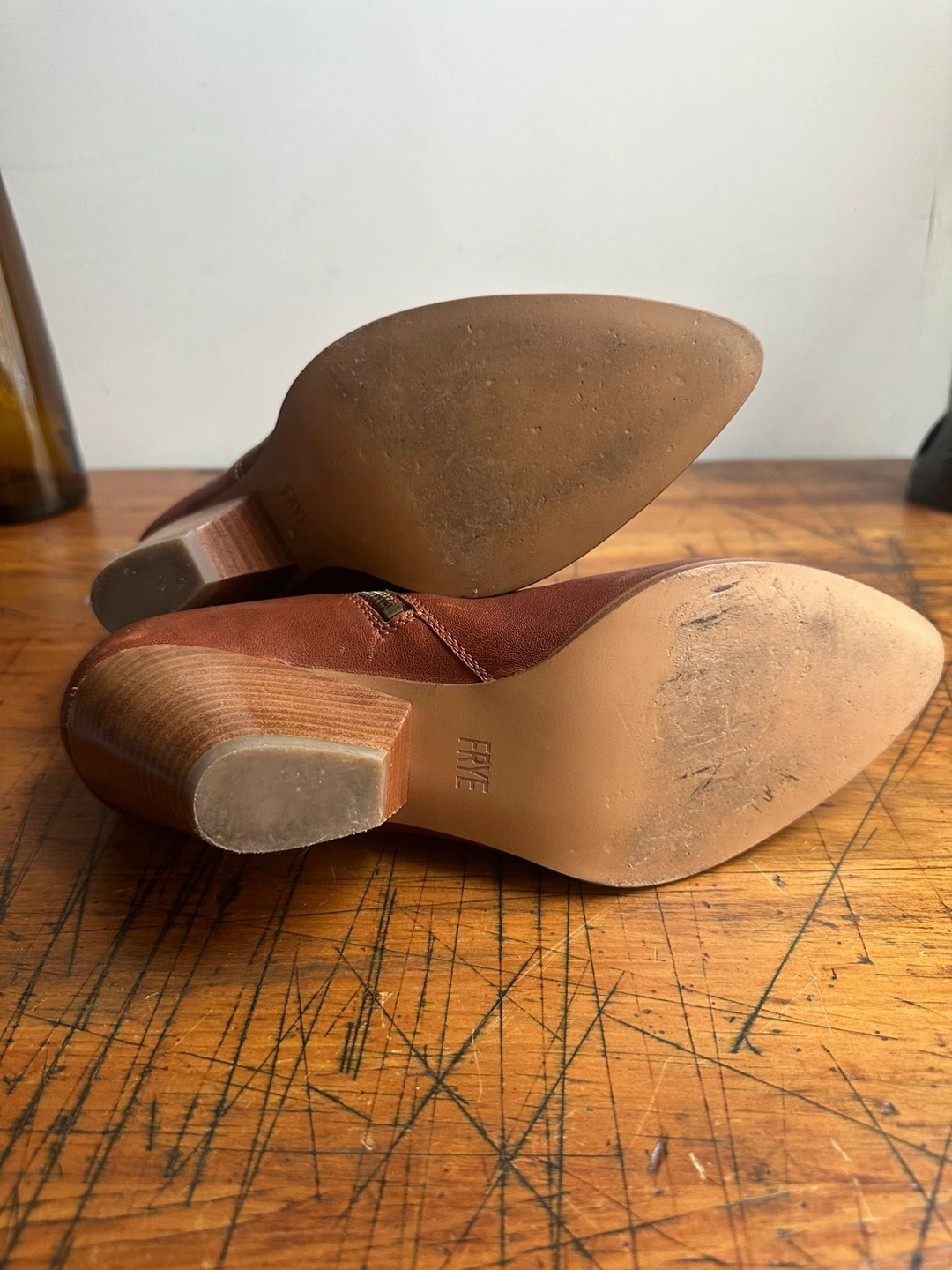 FRYE Reina Cognac Leather Stitch Detail Wooden Stacked Heel Western Booties Size 10