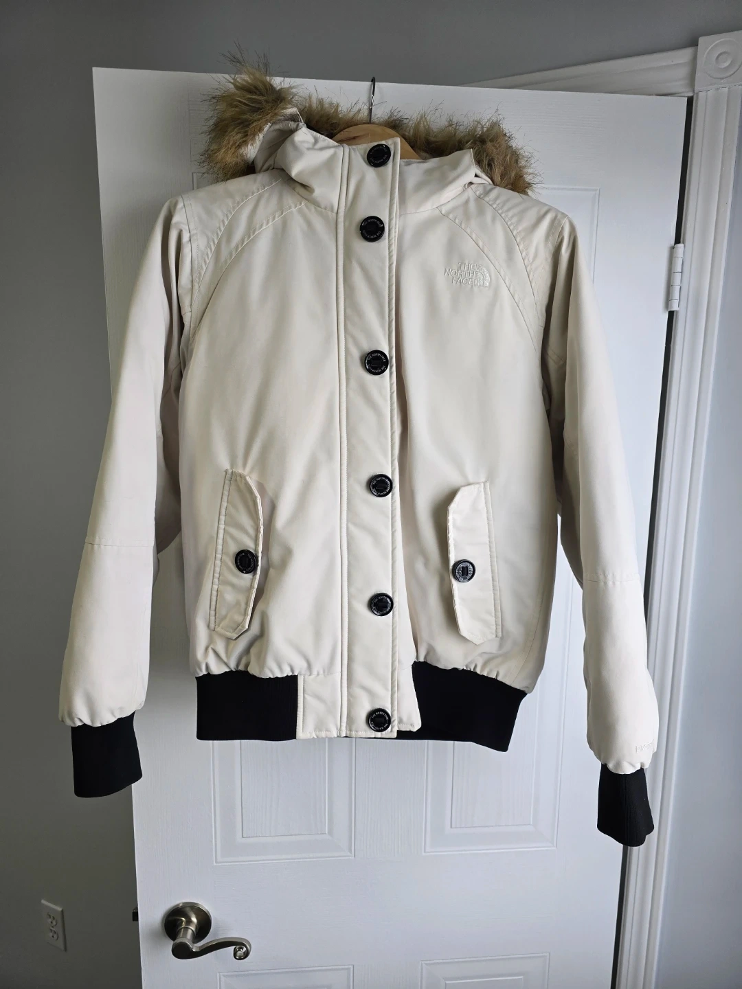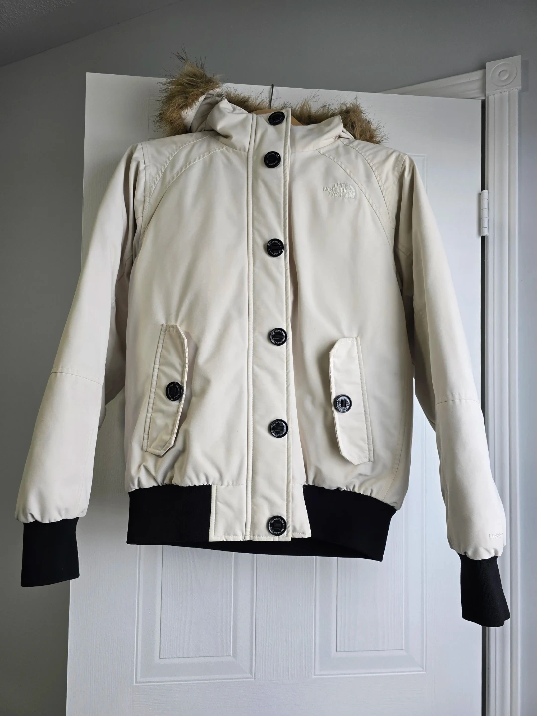 This cream-coloured winter jacket by The North Face is stylish and warm. It features a faux-fur trimmed hood and black button closures. Ribbed cuffs and hem provide a snug fit. It's a great jacket for chilly days!