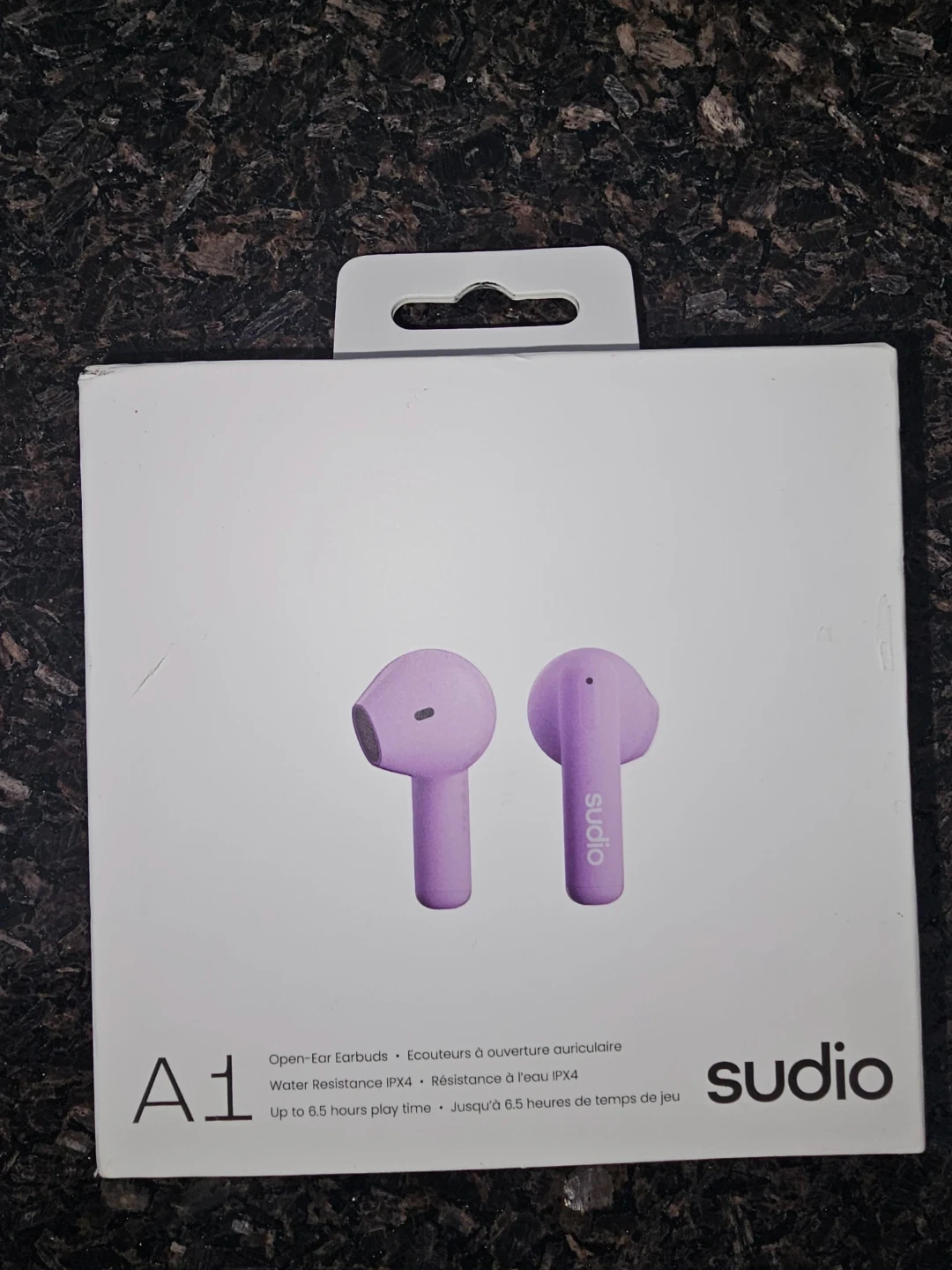Selling a brand new pair of Sudio A1 earbuds in lavender! They are water resistant with an IPX4 rating. The box includes the earbuds themselves. They have up to 6.5 hours of play time. These are the no-fuss earbuds!