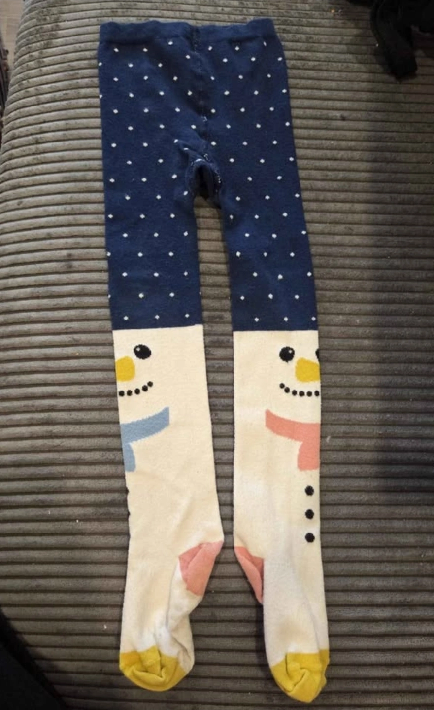 15Cute kids' leggings with a navy polka dot pattern on top and snowman faces on the bottom! The feet have pink and yellow accents. Perfect for the winter season!