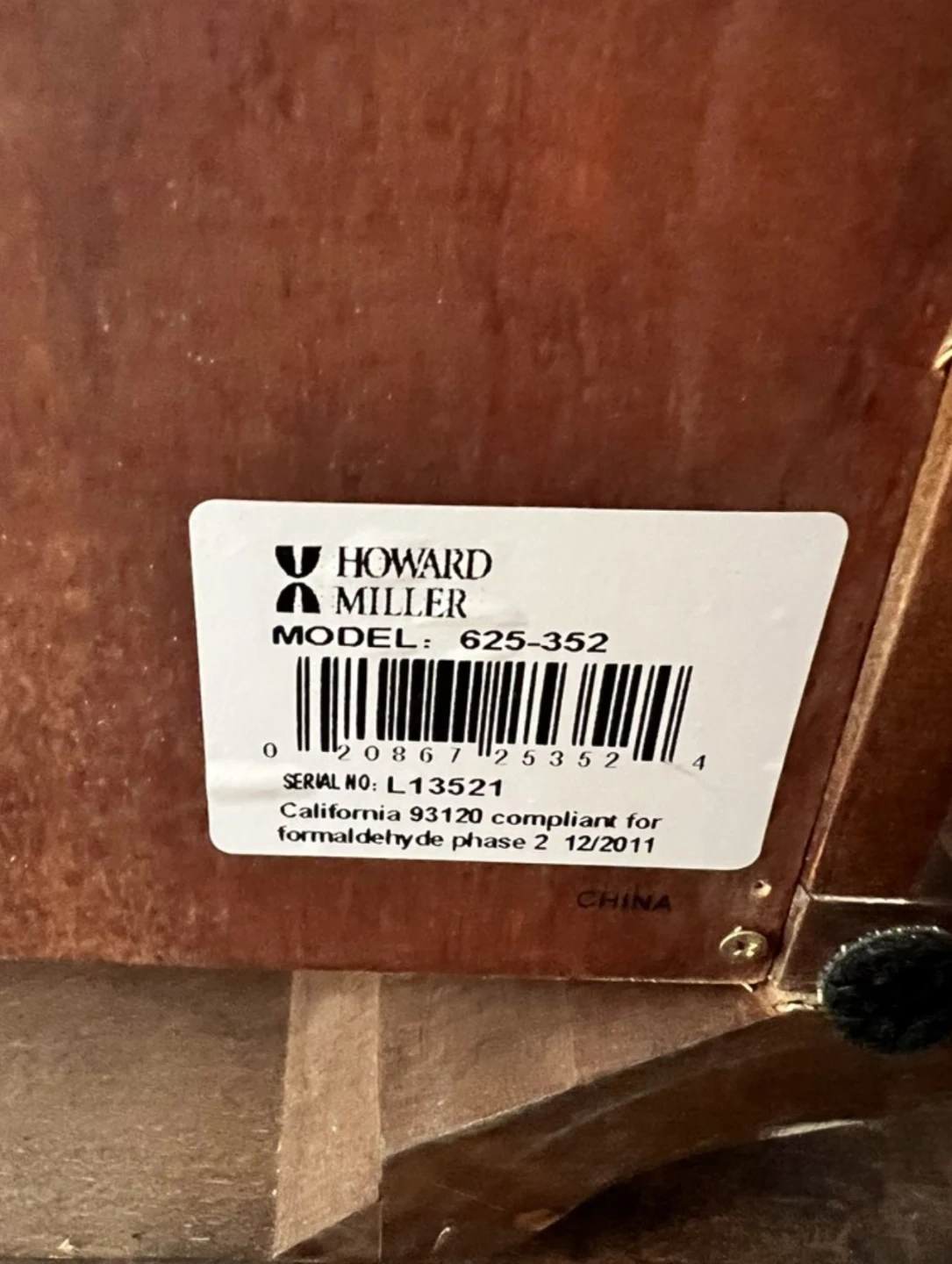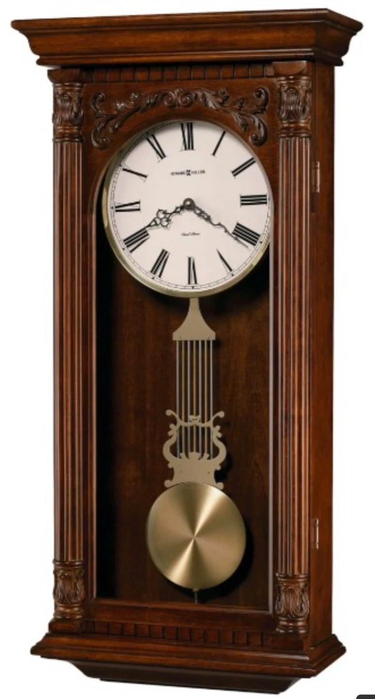 This is a Howard Miller 625-352 pendulum wall clock. It features a classic wooden case with ornate carvings and a brass pendulum. The clock face has Roman numerals for easy reading. It's a beautiful statement piece for any room!