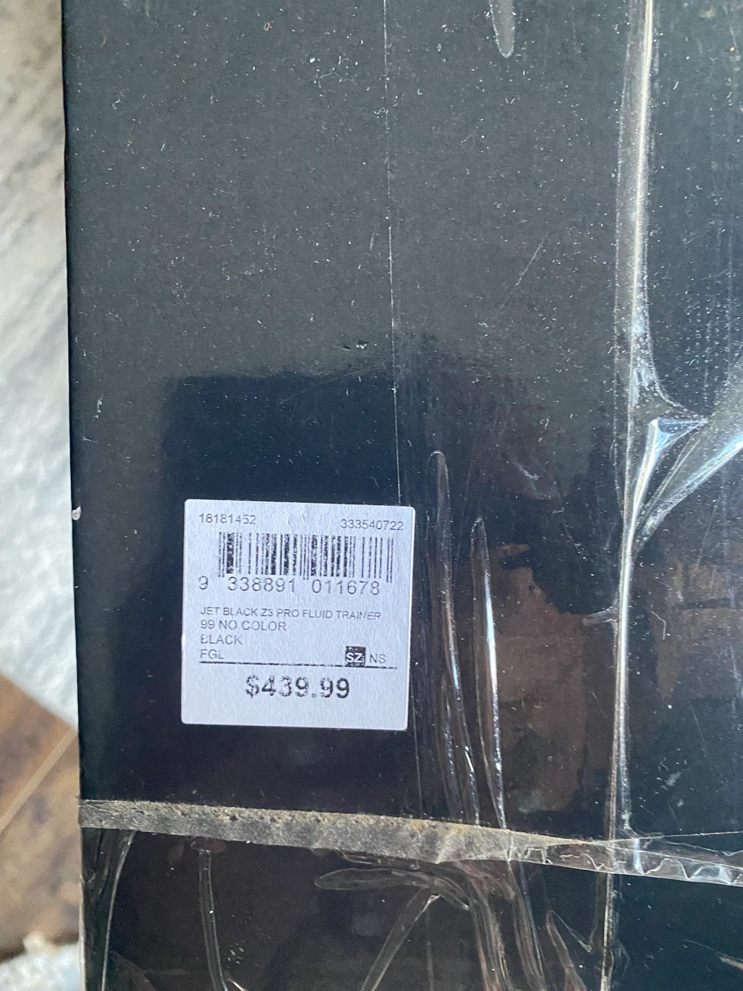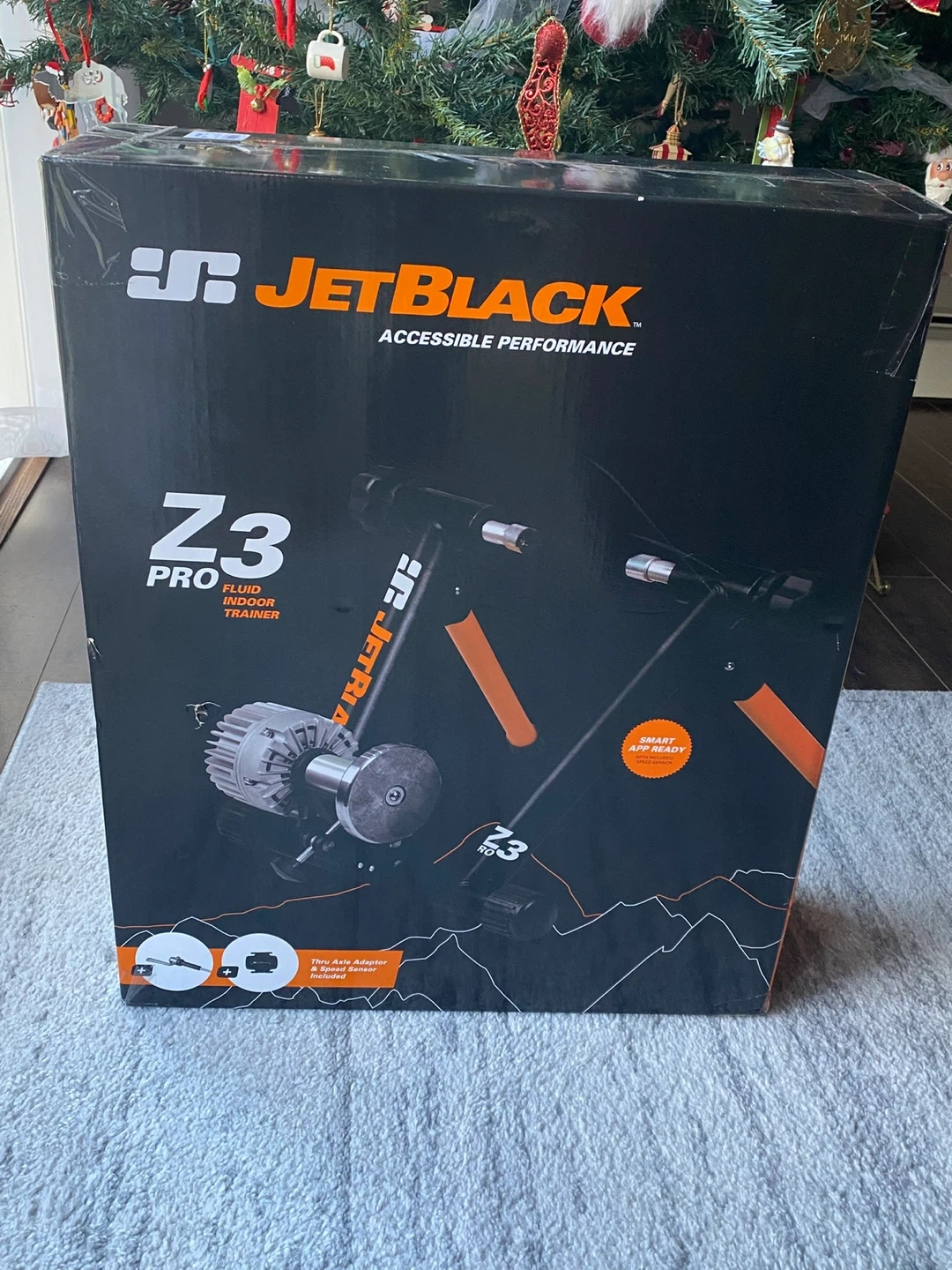 This is the JetBlack Z3 PRO Fluid Indoor Trainer. It's designed for a realistic ride feel with smooth resistance up to 900 watts. Includes thru-axle adapter and speed sensor.