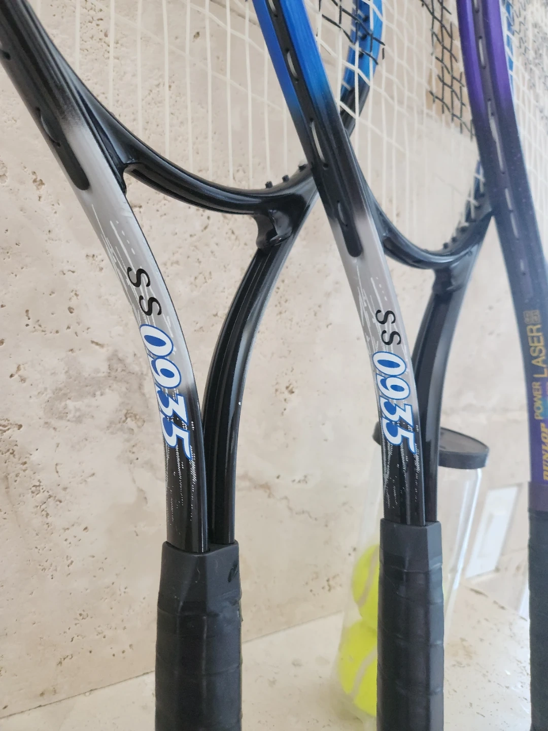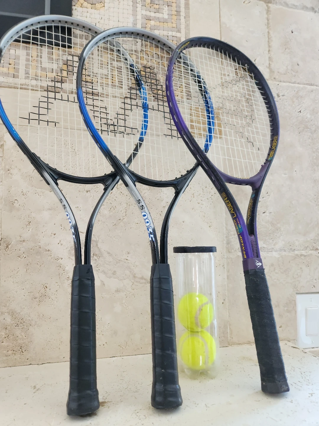 Three tennis rackets are included, two with "SS 0933" markings and one "Dunlop Power Laser Wide Body". A tube with three tennis balls is also present. A carrying bag is included.