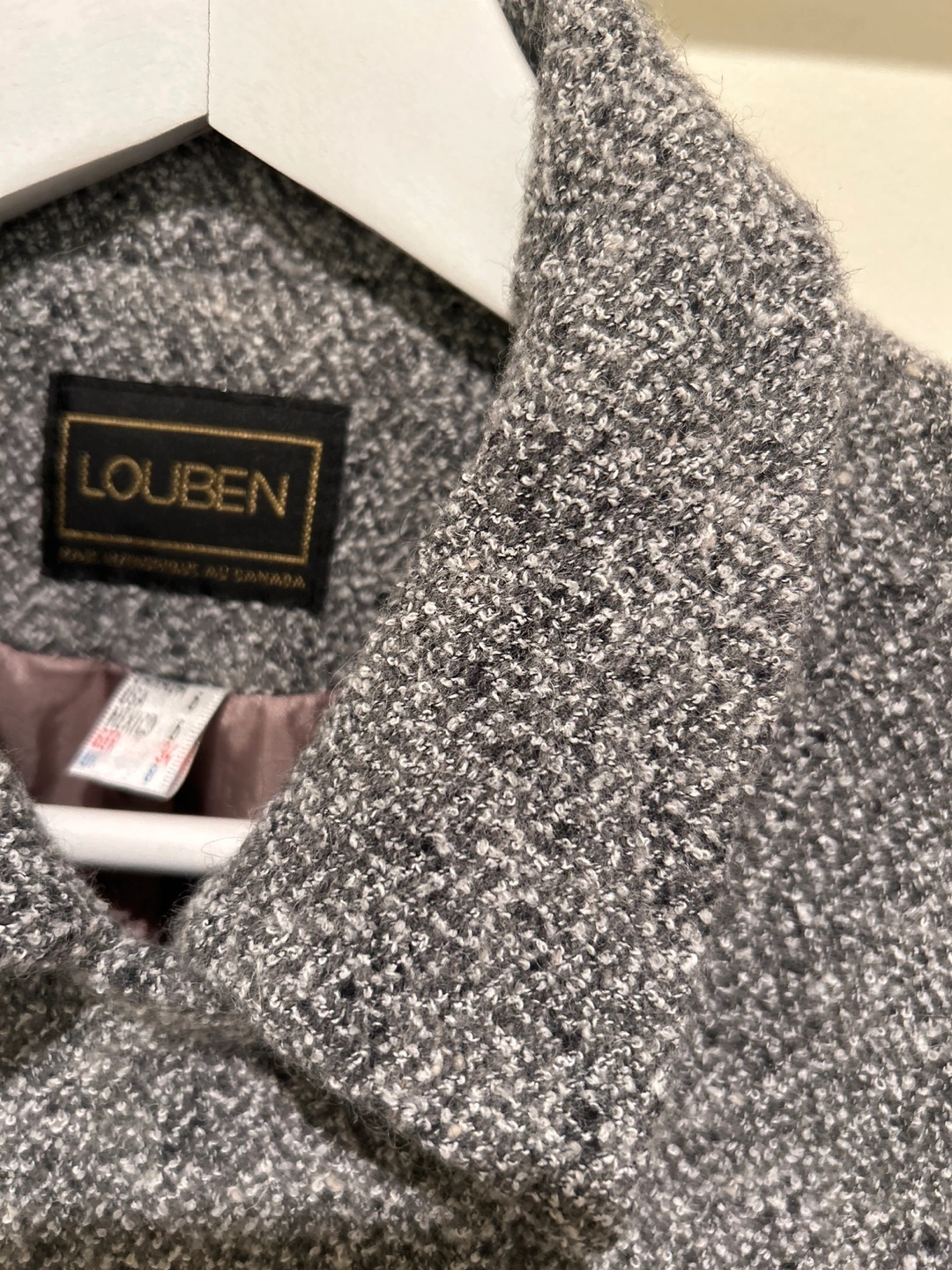 This Louben women's double-breasted coat is a stylish outerwear piece. It features a textured grey tweed-like fabric with a classic collar and button closure. Made in Canada.
