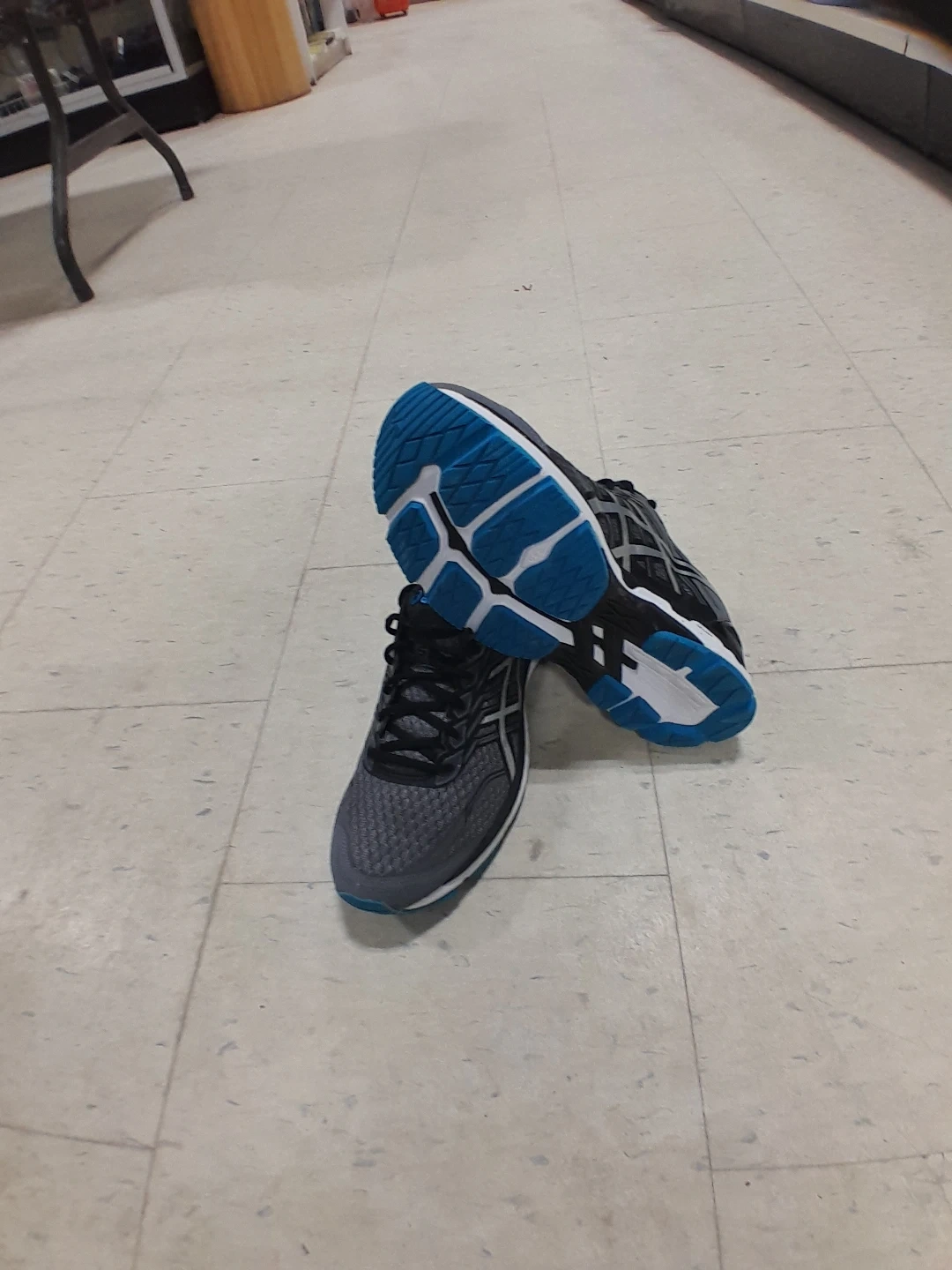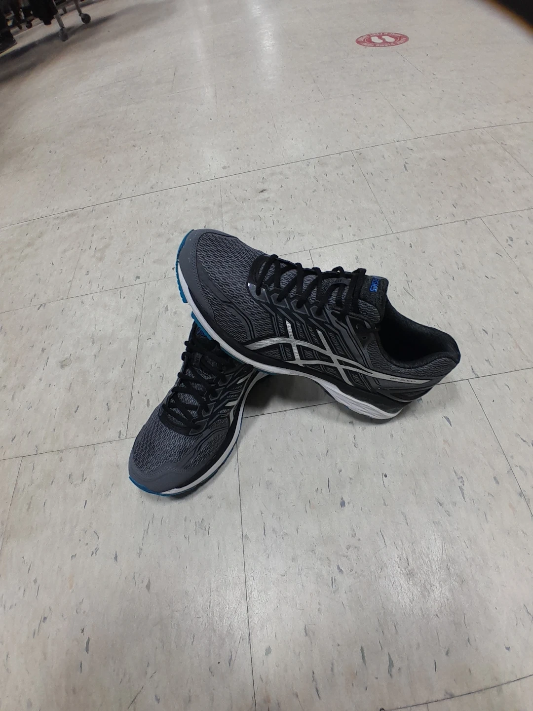 ASICS Gel-Cumulus 20 running shoes in grey and black with white accents. These shoes feature a breathable mesh upper and GEL cushioning for comfort. The rubber outsole provides good traction. Men's size 11