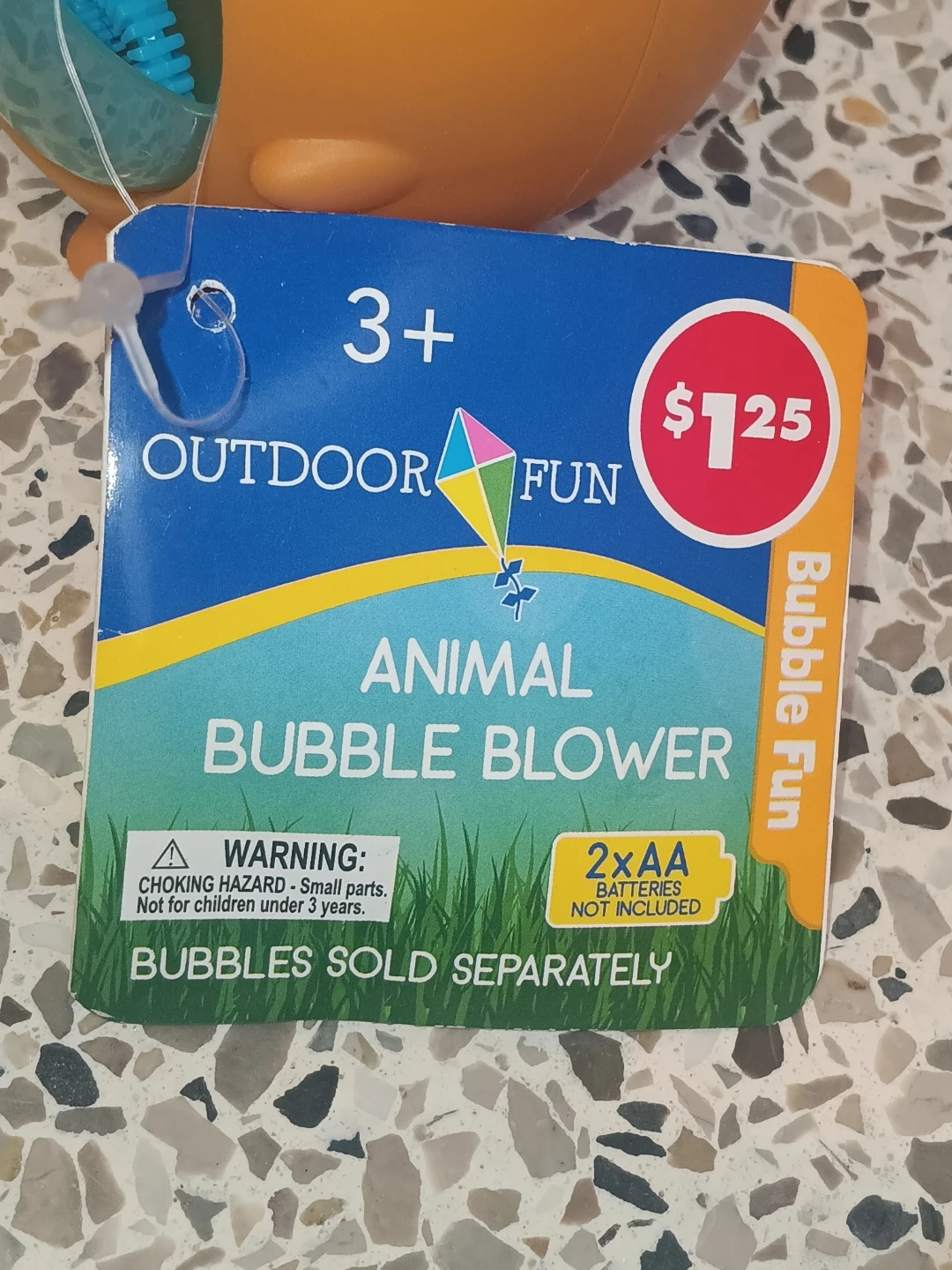 This orange animal bubble blower is for ages 3 and up. It requires 2x AA batteries, which are not included. Bubbles are sold separately. It's great for outdoor fun!