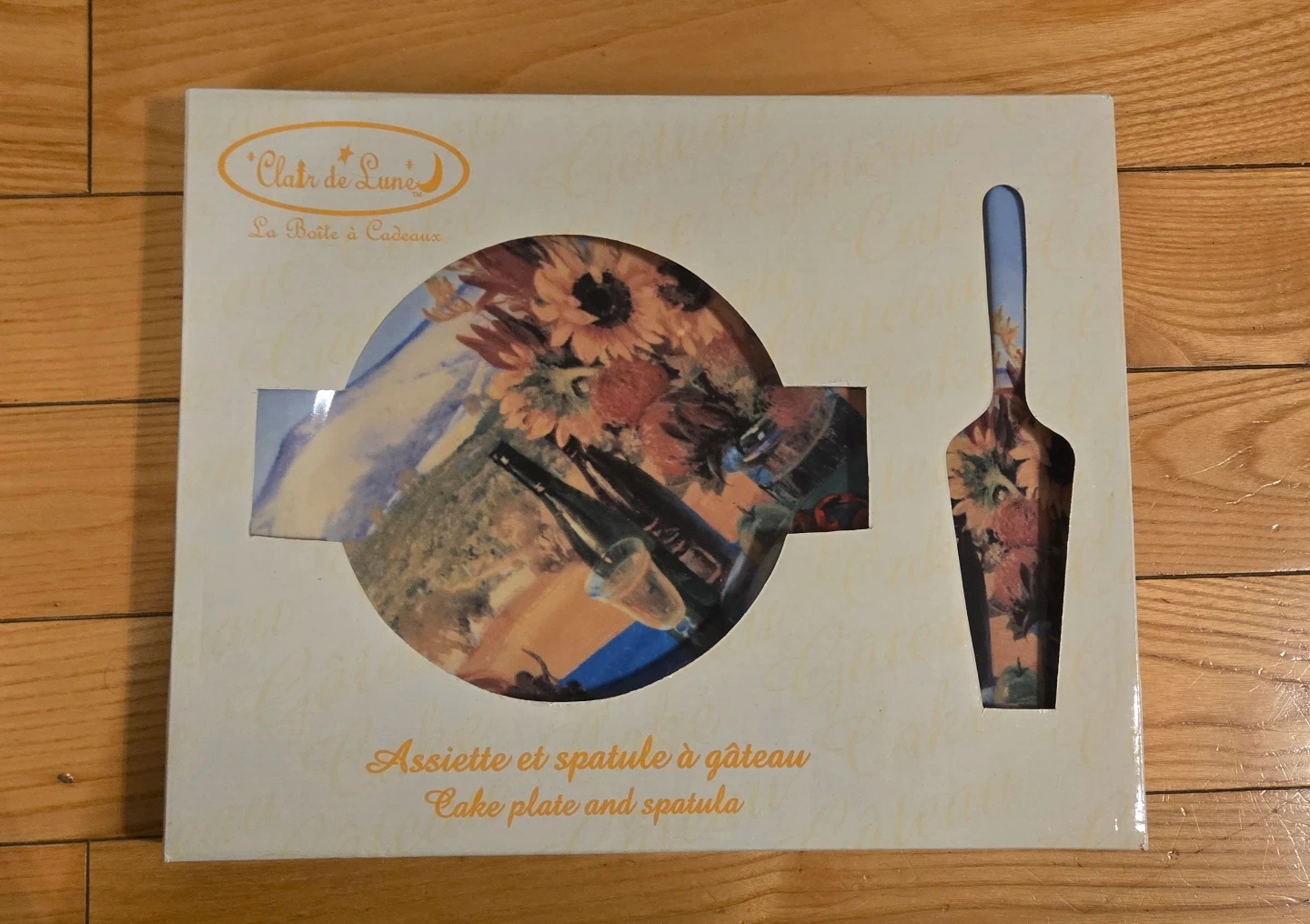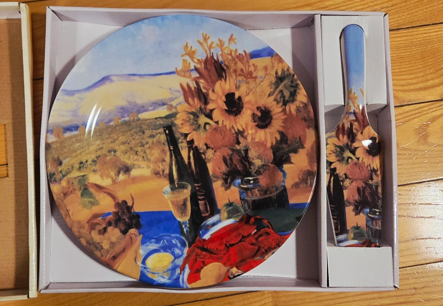 This cake plate and spatula set is from Clair de Lune. It features a beautiful still life design with sunflowers and wine. It's perfect for serving.
