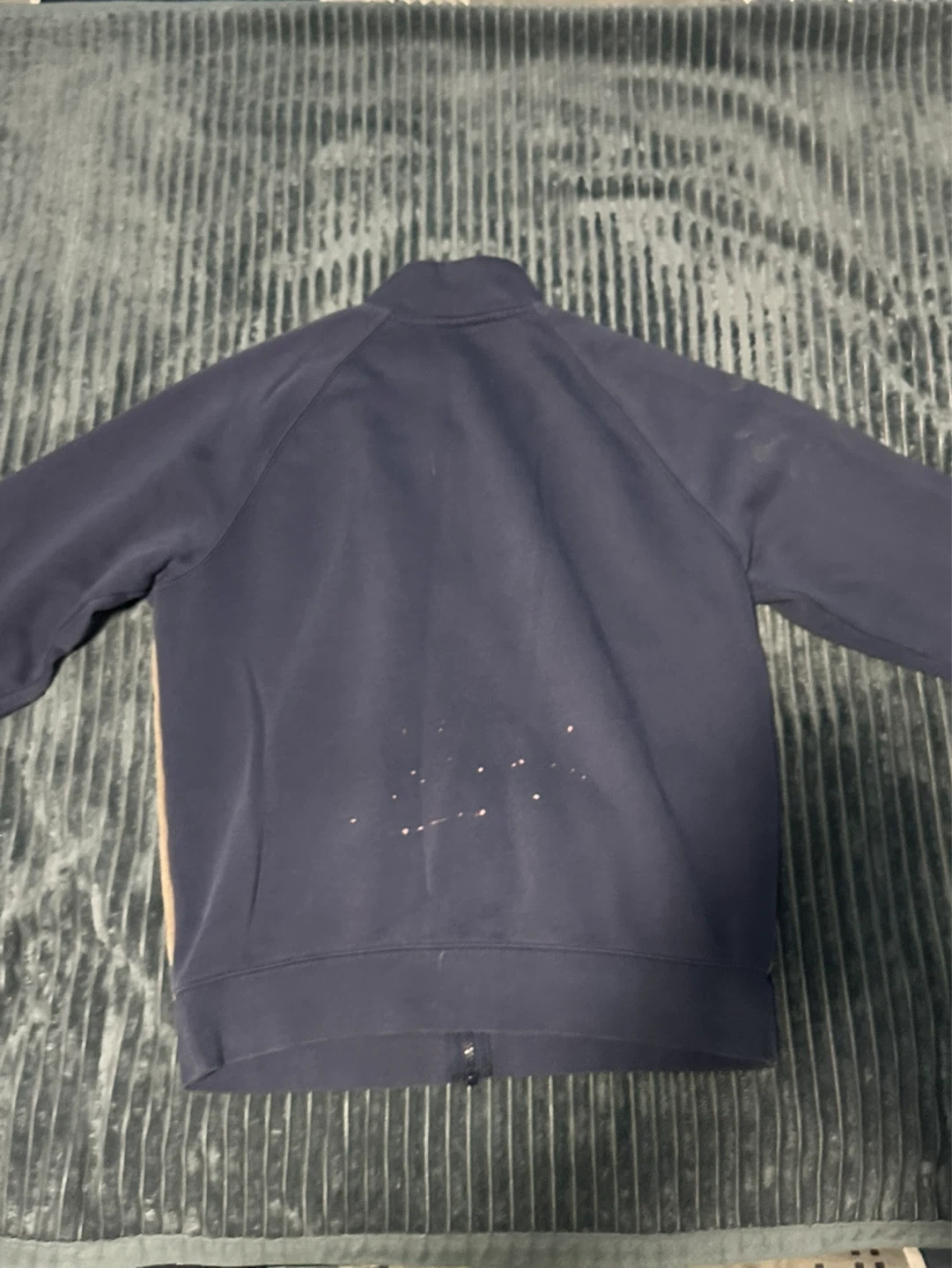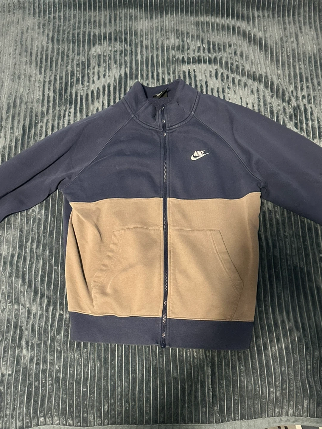 A Nike track jacket with a navy and tan colour block design. It features a full zip closure and two front pockets. There are some light marks on the back.