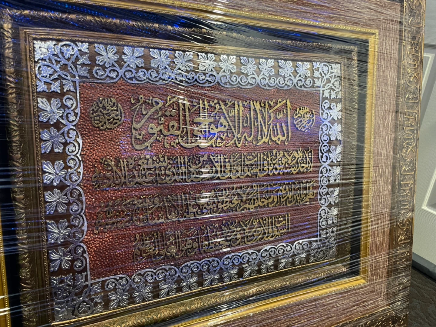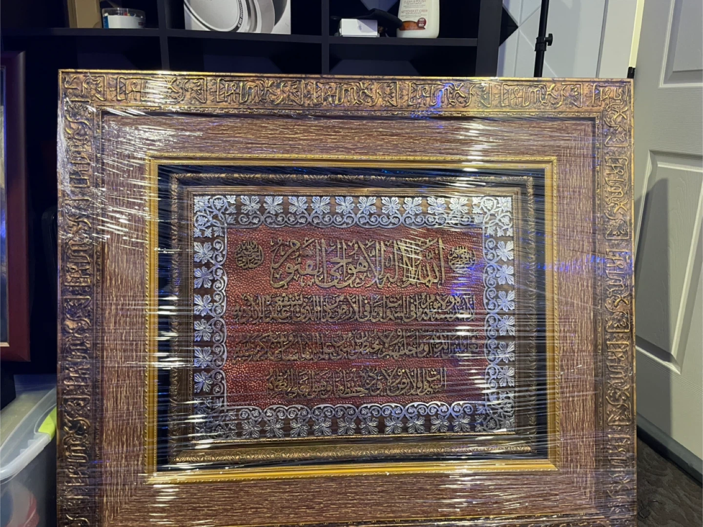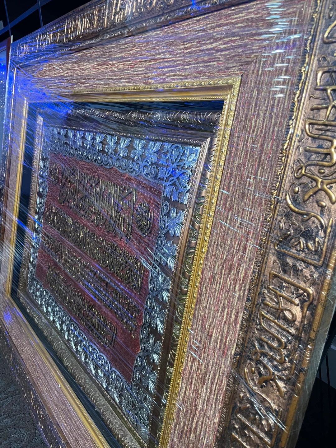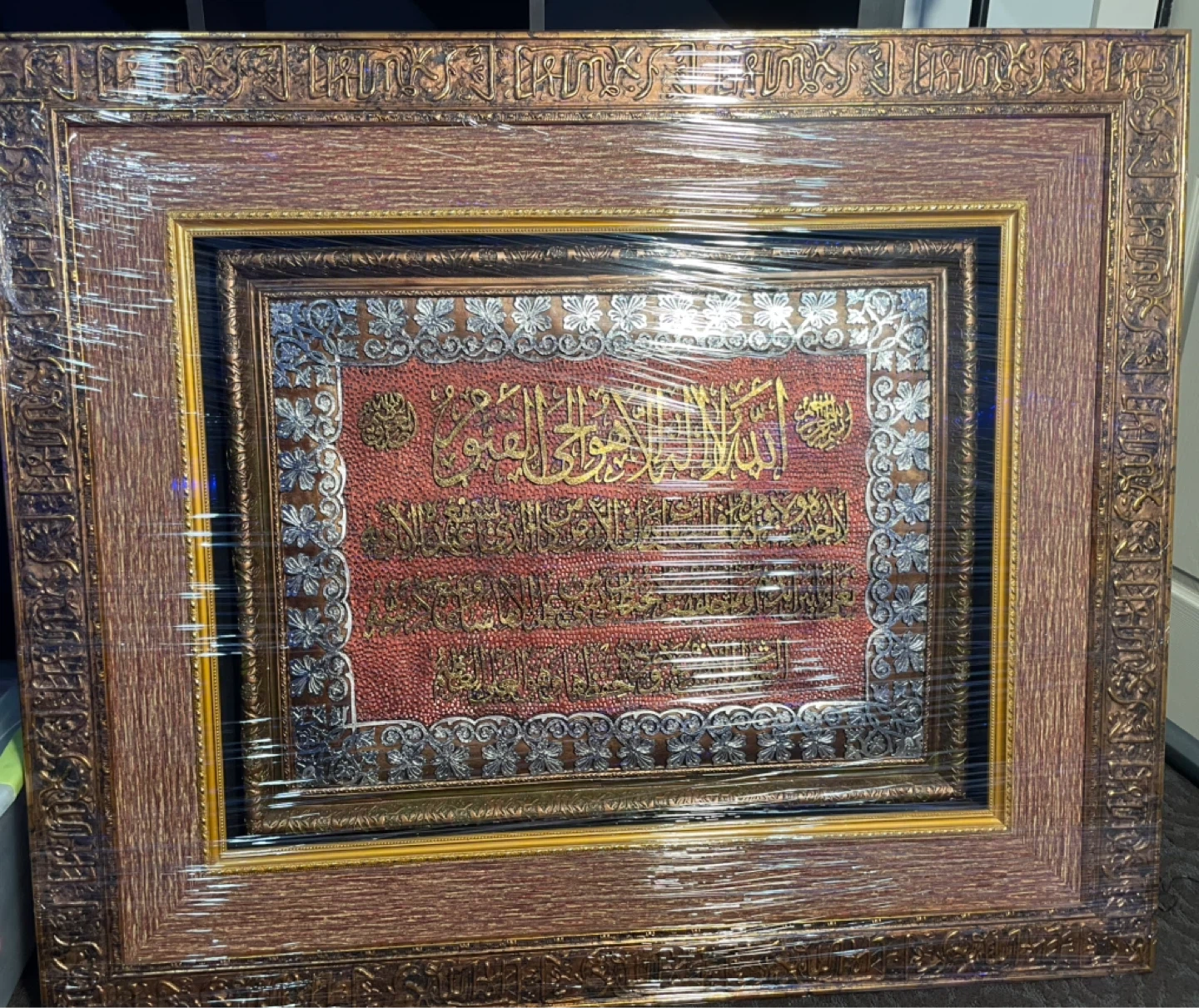Beautiful framed artwork featuring Arabic calligraphy. It has intricate detailing with gold and silver accents on a textured red background. The frame is a warm wood tone with decorative elements. This piece would add a touch of elegance to any room. Worth a lot of money, originally bought for close to $1000. Currently in the process of moving which is why I’m selling it. It is in completely new/excellent condition, no damage, perfectly fine. $650 might seem like a lot, price can be negotiated to a reasonable amount. The picture is high quality, heavy, and is 40 x 40 inches. Wrapped up nearly in Saran Wrap for protection purposes.