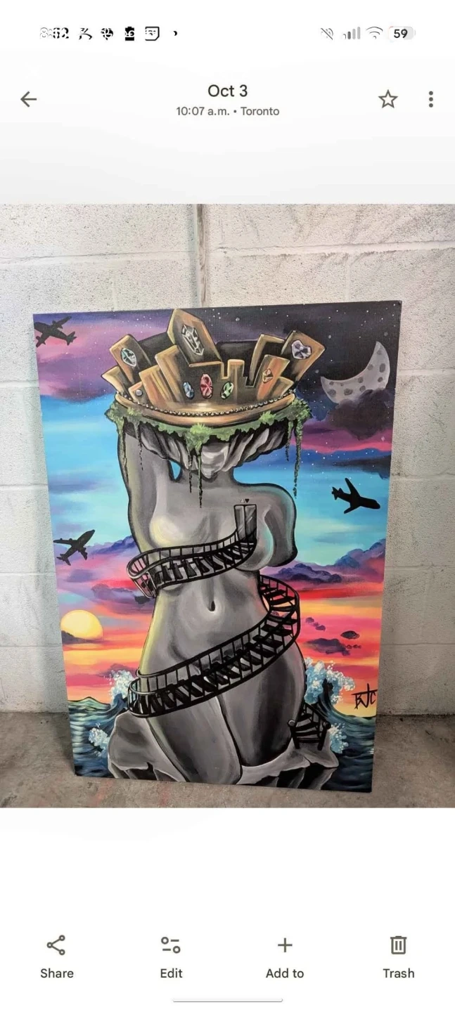 This is an original abstract painting depicting a surreal landscape with a Grecian-inspired statue. It features a vibrant sunset, ocean waves, a moon, and airplanes in the sky. The artwork is signed by the artist
