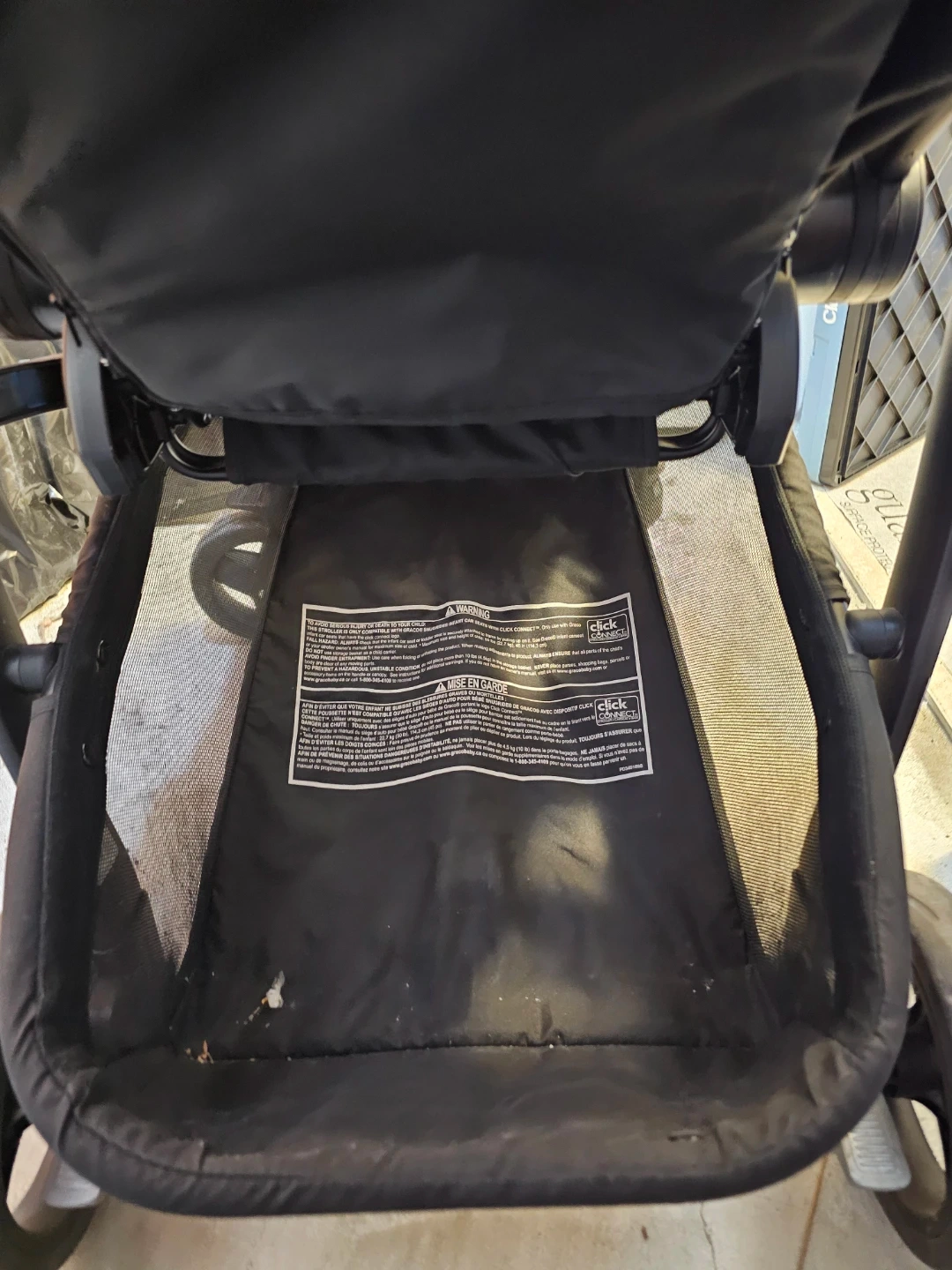 This black Graco stroller features a click connect system for easy infant car seat attachment. It has a large storage basket and a parent console with cup holders. The seat reclines for comfort. It's a handy stroller for daily outings!