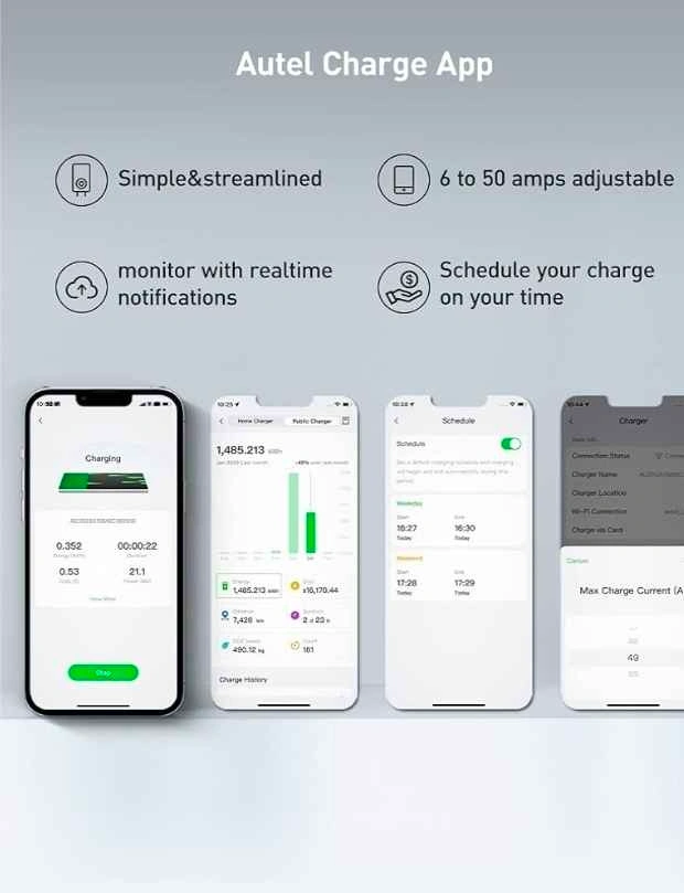 Powerful Autel Level 2 EV charger. Charges super fast, up to 50A, adding about 37 miles per charging hour. Works with most electric cars, including Tesla, BMW, Ford, Mercedes, and Kia. Built tough with a NEMA Type 4 rating, it's resistant to rain, snow, sand, and heat. Home Smart AI Electric Vehicle (EV) Charger, Wi-Fi and Bluetooth Enabled EVSE, with in-Body Holster and 25-Foot Cable. Hardwired. Sierra Blue color.