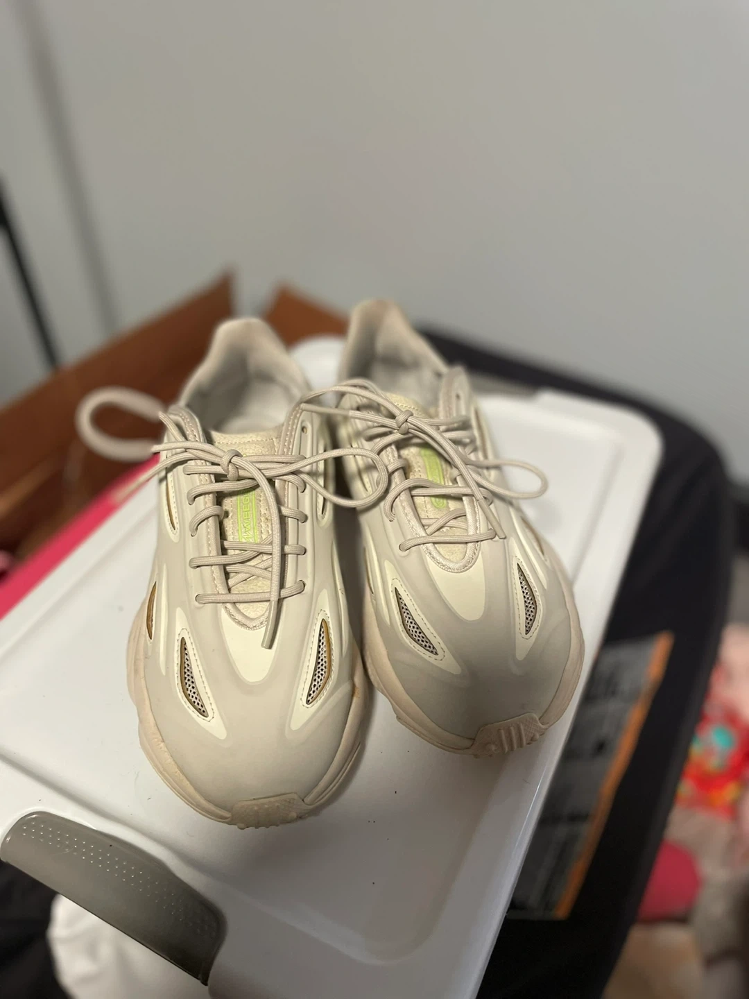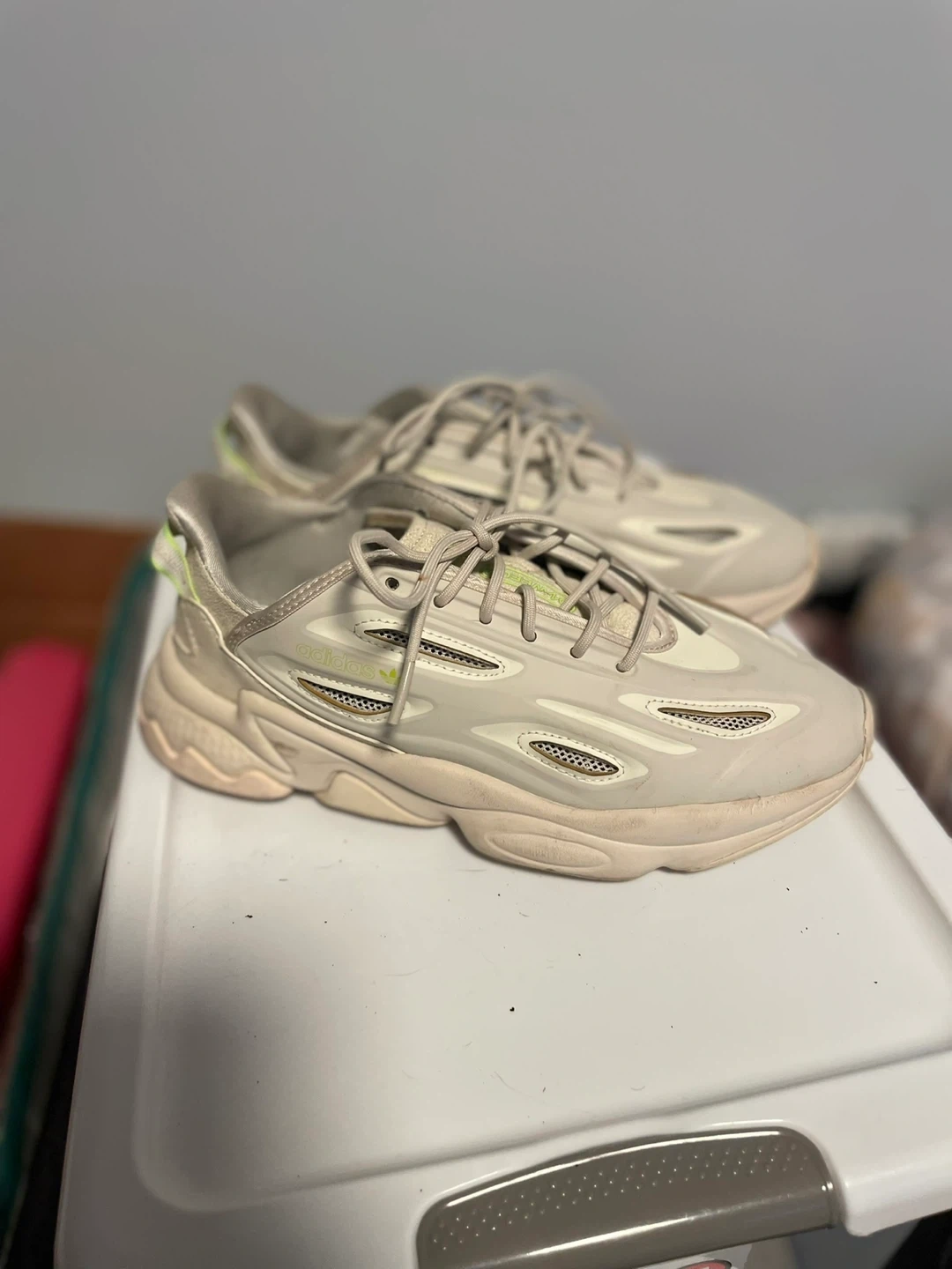These Adidas Ozweego sneakers feature a light beige and cream colorway with subtle lime green accents. They're made with a combination of mesh and synthetic materials for comfort and breathability. The classic silhouette offers a retro-inspired look.