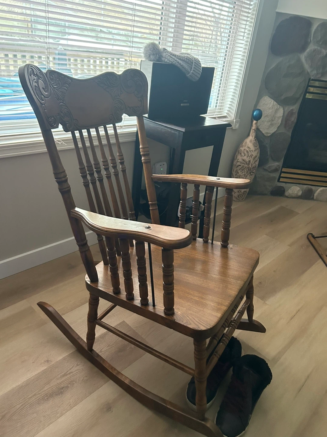 This is a classic wooden rocking chair with an ornate carved back. It's made of solid wood with a warm, natural finish. The rocking mechanism works smoothly. Adds a cozy touch to any room!