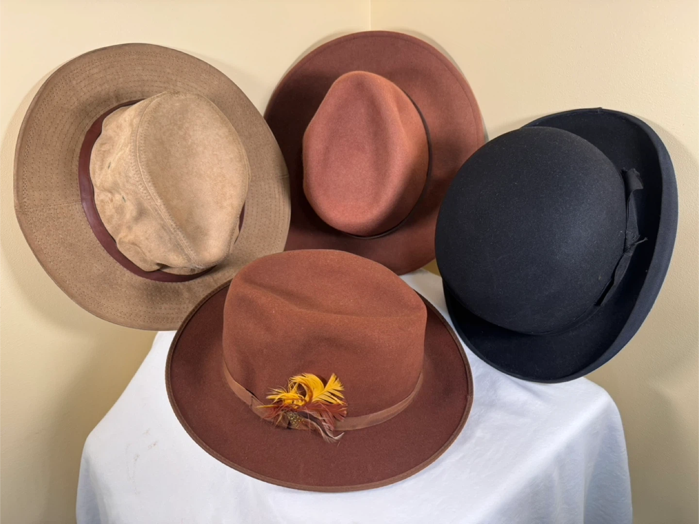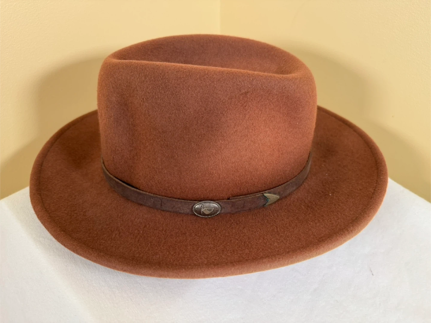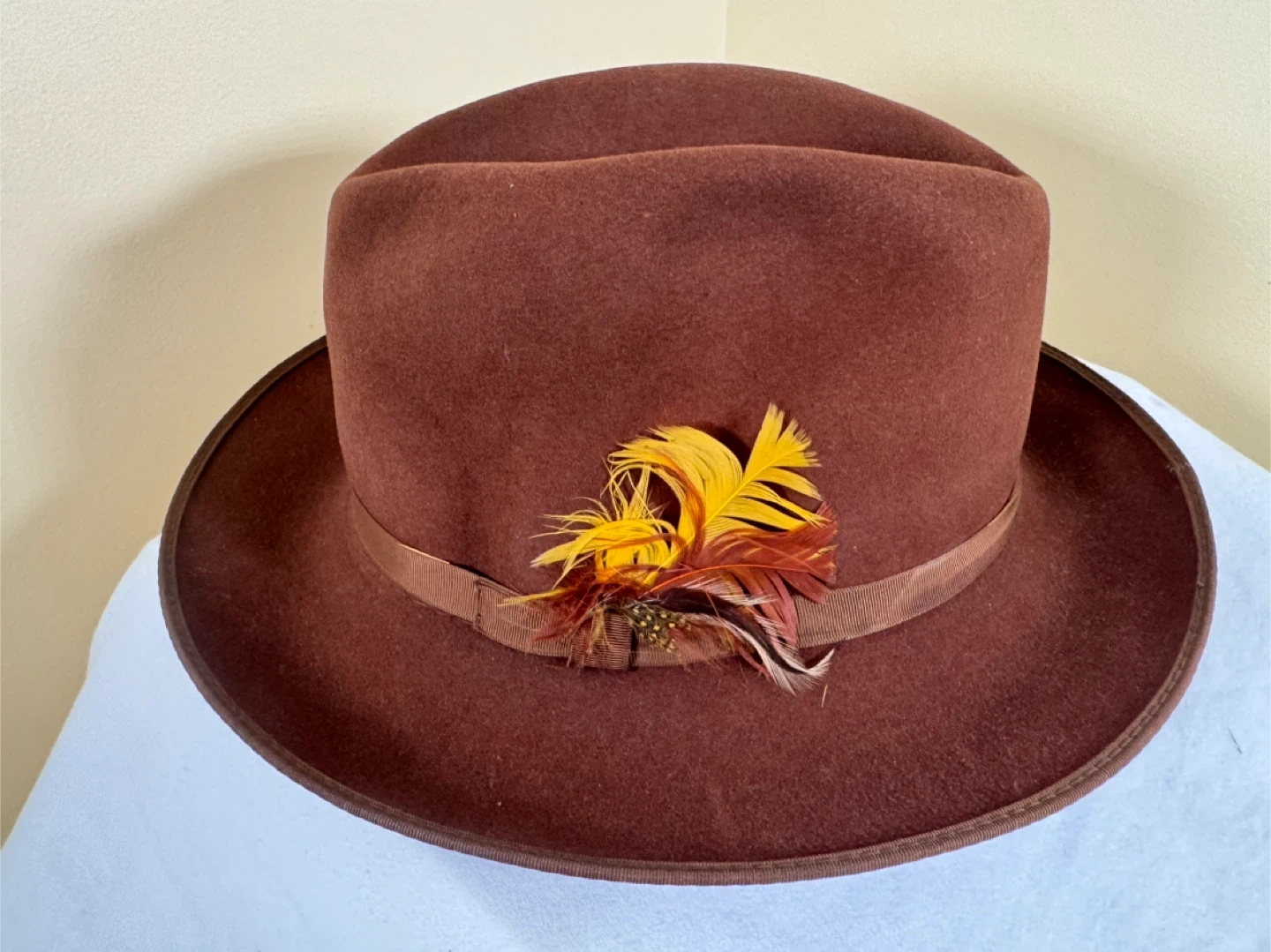 Perry Ellis Portfolio fedora hat in brown. Size 7 1/8. Made in U.S.A. It features a decorative feather band. Sombreros clásicos para hombre. Todos $35, uno $15