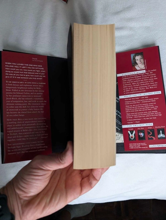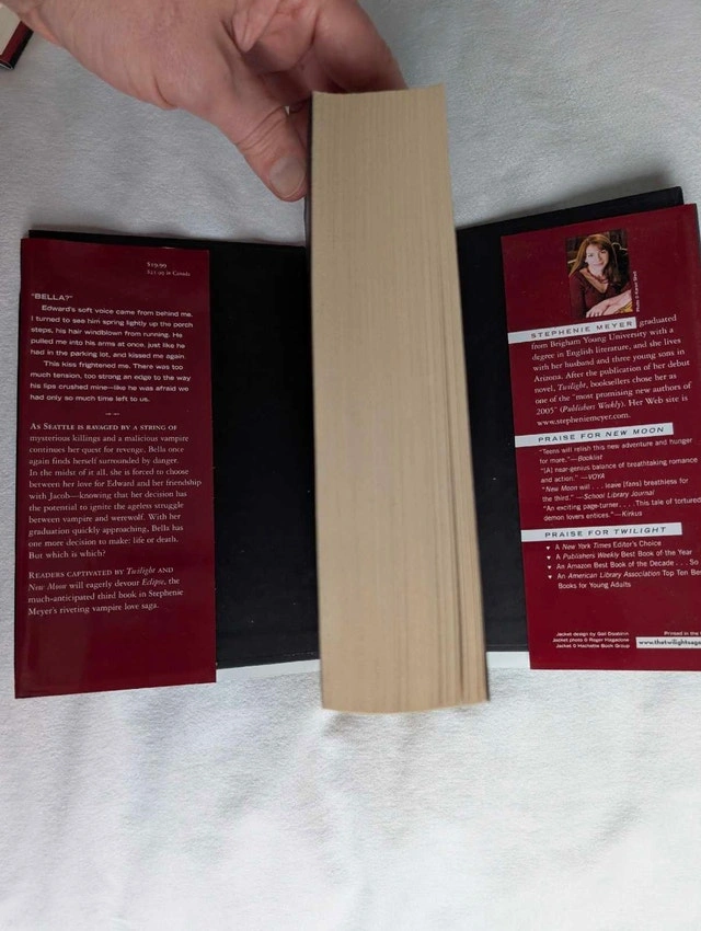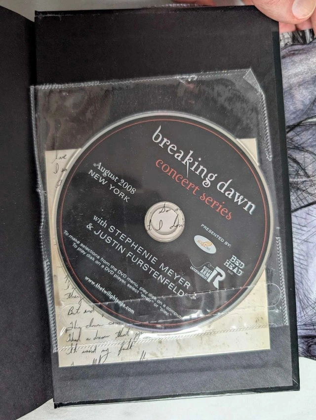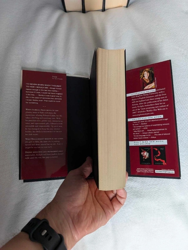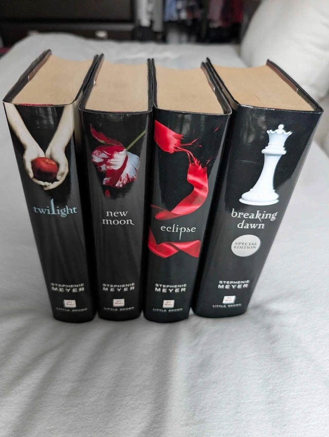 Selling a complete 4-book hardcover set of the Twilight Saga by Stephenie Meyer. Condition: Mint / Like New. These books are pristine. The bindings are tight, pages are crisp, and the dust jackets have no tears, folds, or fading. Perfect for a display shelf. Includes: Twilight (Hardcover), New Moon (Hardcover), Eclipse (Hardcover), Breaking Dawn (Hardcover) - Special Edition: This rare version includes the exclusive Breaking Dawn Concert Series DVD and a Full-Colour Poster of Bella and Edward (both included and intact inside the book). This is a beautiful, gift-quality set for a fan who wants a perfect copy without the wear and tear usually found on used books. Available for pickup in Downtown Toronto at Homewood Avenue and Wellesley Street.