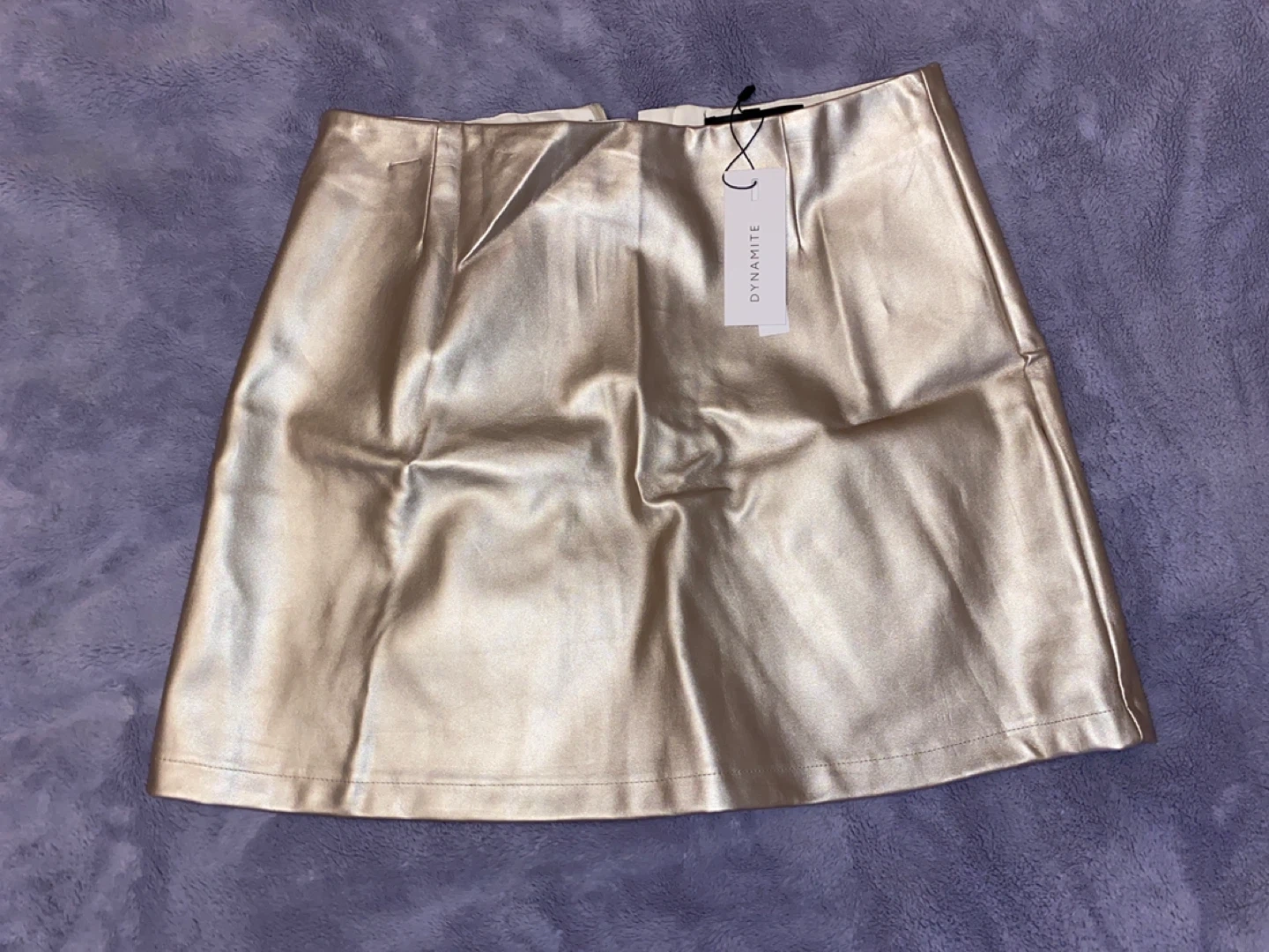 This is a brand new Dynamite Kaila mini A-line skirt! It's a size medium and has a metallic PU finish. The tag says it's style AS-0335. Originally bought for $44.95
